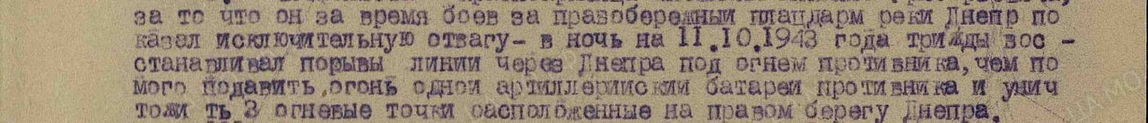 | Награждён: Медаль "За отвагу" | 18.12.1943 | Приказ по 1110-му армейскому пушечному артиллерийскому полку от 18 декабря 1943 года. Награжден телефонист-красноармеец Васенин Михаил Григорьевич, за то, что он за время боев за правобережный плацдарм реки Днепр показал исключительную отвагу -- в ночь на 11.10.1943 года трижды восстанавливал порывы линии через Днепр под огнем противника, чем помог подавить огонь одной артиллерийской батареи противника и уничтожить 3 огневые точки, расположенные на правом берегу Днепра. Воинское звание: красноармеец Воинская часть: 1110 пап Кто наградил: 1110 апап Наименование награды: Медаль «За отвагу» Номер документа: 17/н Дата документа: 18.12.1943 Место призыва: Санчурский РВК, Кировская обл., Санчурский р-н Приказ подразделения №: 17/н от: 18.12.1943 Издан: 1110 апап Информация об архиве - Архив: ЦАМО Фонд ист. информации: 33 Опись ист. информации: 690155 Дело ист. информации: 445 Информация об архиве - Архив: ЦАМО Картотека: Картотека награждений Расположение документа: шкаф 15, ящик 16 | |