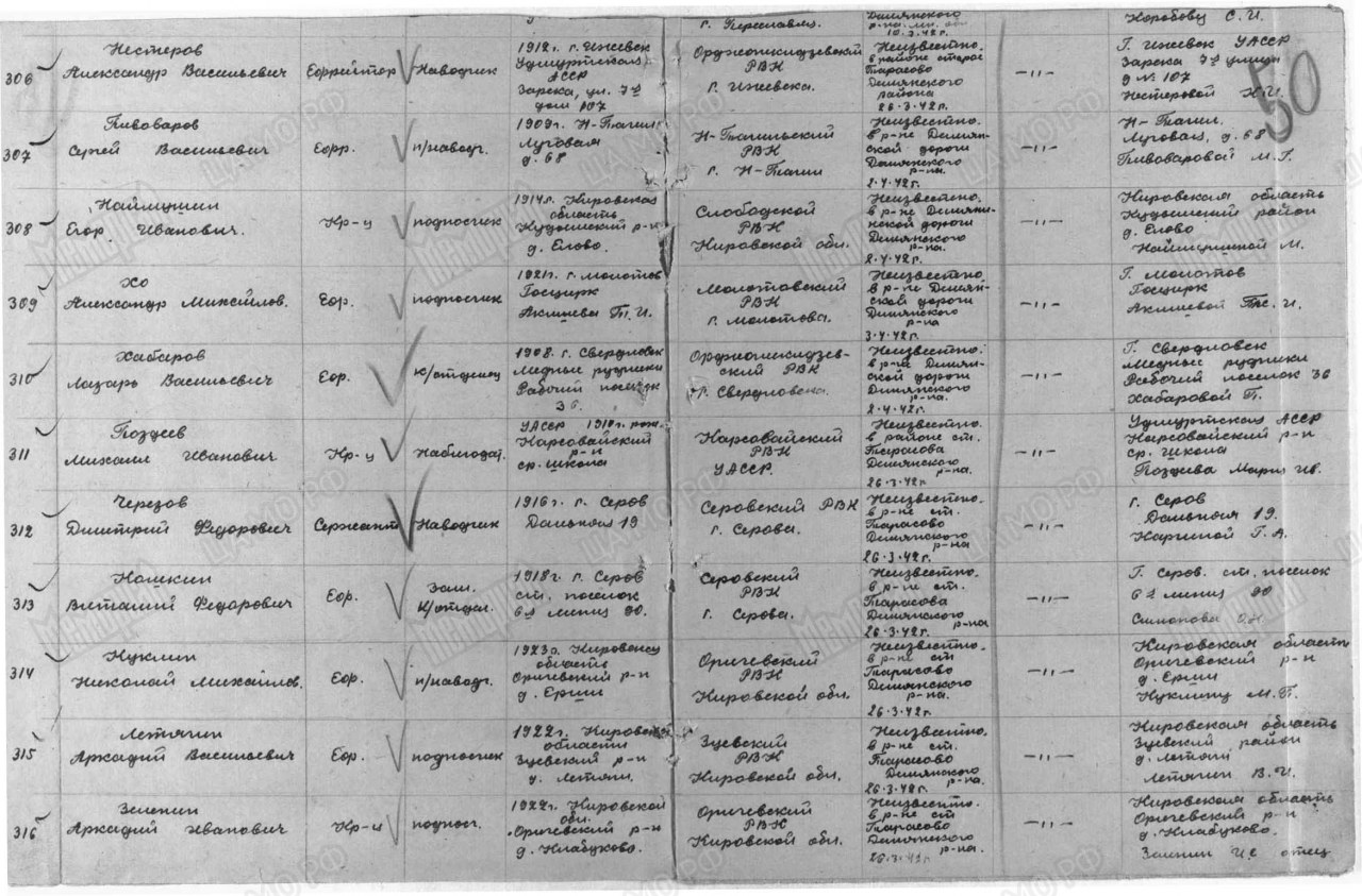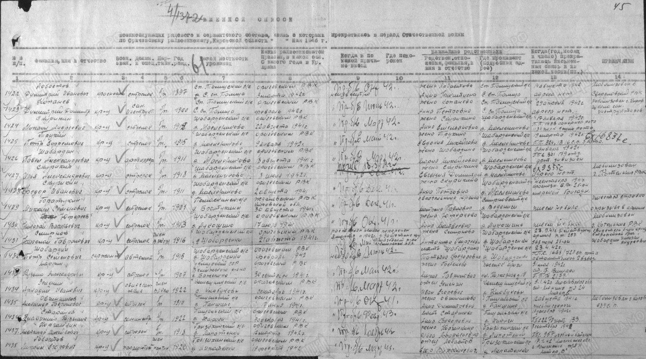 | 4308331008 | ЗЕЛЕНИН Аркадий Иванович | 1922 г. р., д. Клобуковы Камешницкого с/с, красноармеец, авиадесантник, Московская обл., ст. Монино, 24 п-я, литер Е, в марте 1942 г. пропал без вести. | Кировская область, Оричевский район | |||