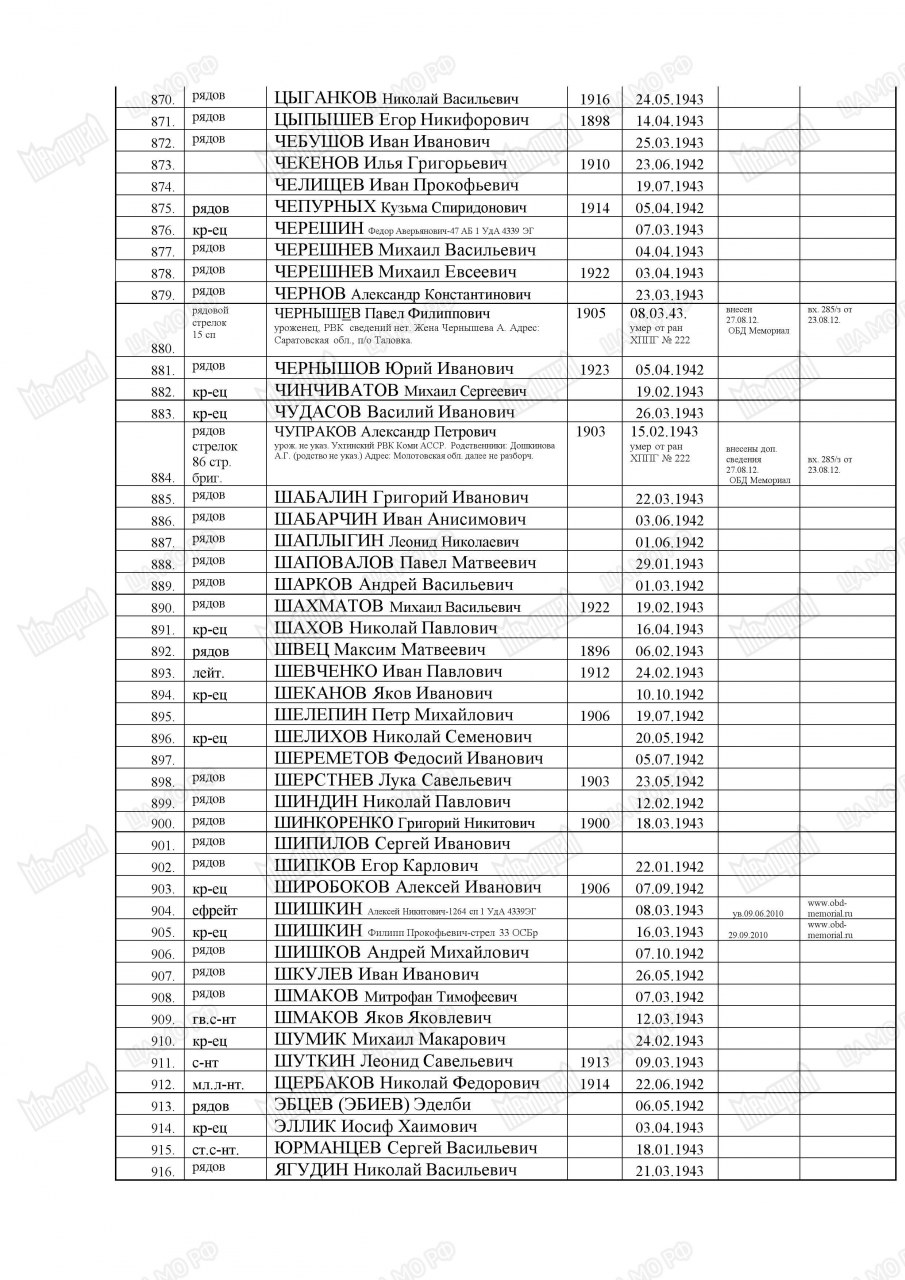 | 4308474018 | ЧЕПУРНЫХ Кузьма Спиридонович | 1915 г. р., д. Сметановщина Пищальского с/с, призван Оричевским РВК, красноармеец 144 об, погиб в бою 19.08.1942 г. Захоронен в Демяновском р-не, д. Борисово, Новгородская обл. | Кировская область, Оричевский район |