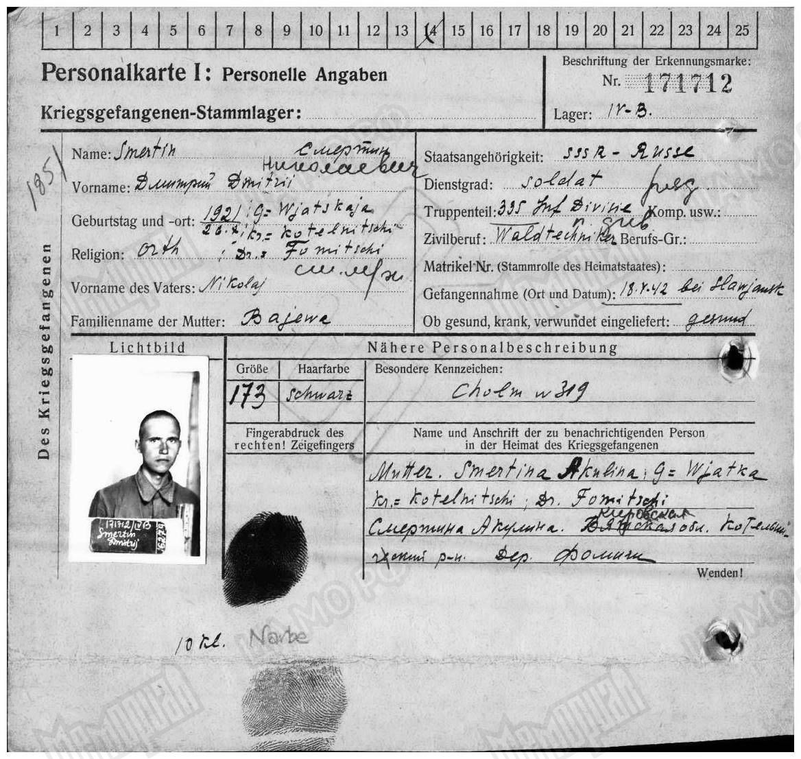 | Попал в плен | 18.04.1942 | Славянск (в районе) (Донецкая (Сталинская) область, Украина) | www.obd-memorial.ru |
