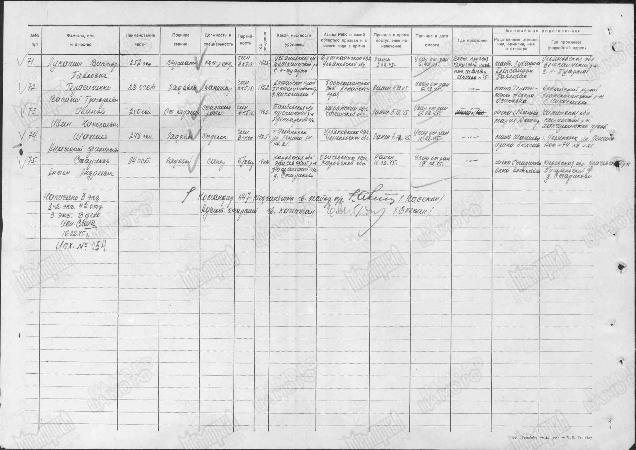 | Умер | 16.02.1945 | умер от ран в 90 МСБ | |