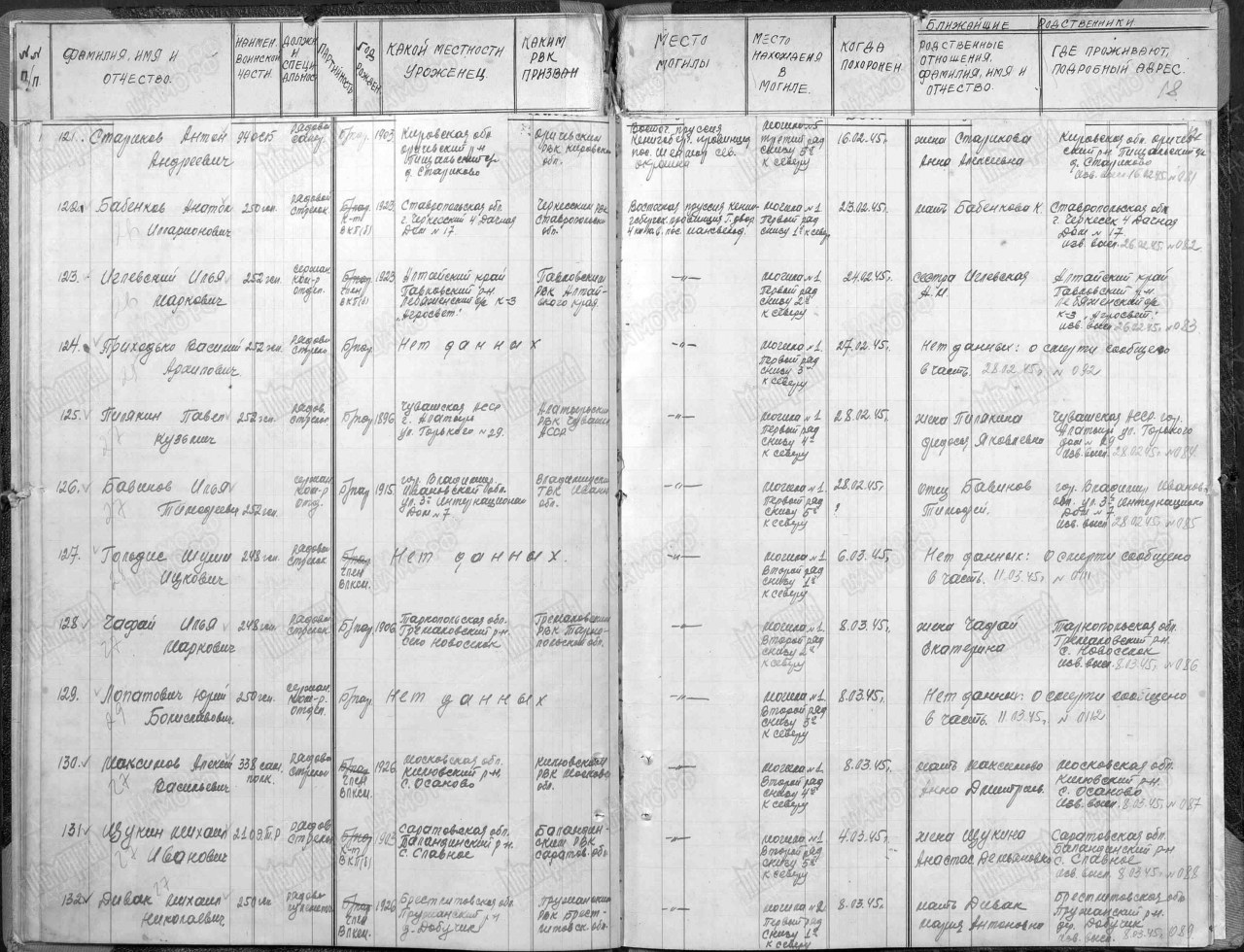 | 4308451024 | СТАРИКОВ Антон Андреевич | 1903 г. р., д. Стариковы Пищальского с/с, рядовой, сапер, 95 осб, 10.02.1945 г. умер от ран. Захоронен в Восточной Пруссии, северный округ пос. Шенасор, в братской могиле № 5. | Кировская область, Оричевский район |