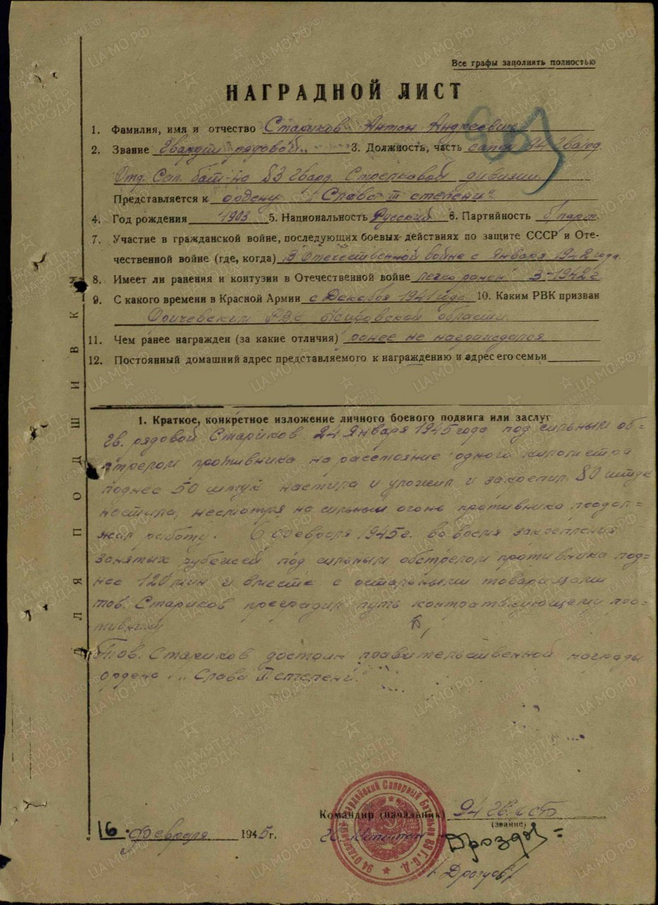 Стариков Антон Андреевич, 1903 г.р., из д. Стариковы Посадской волости Орловского уезда (Оричевский район). Призван Оричевским РВК. Гвардии рядовой, сапер, 94 ОСБ, 83 Гвардейская стрелковая дивизия. Умер от ран 16.02.1945 г. в 90 МСБ. Первичное захоронение: Восточная Пруссия, Кенигсбергский окр., п. Шенмор, северная окраина, могила № 5, 3 ряд снизу. 5-й к северу.