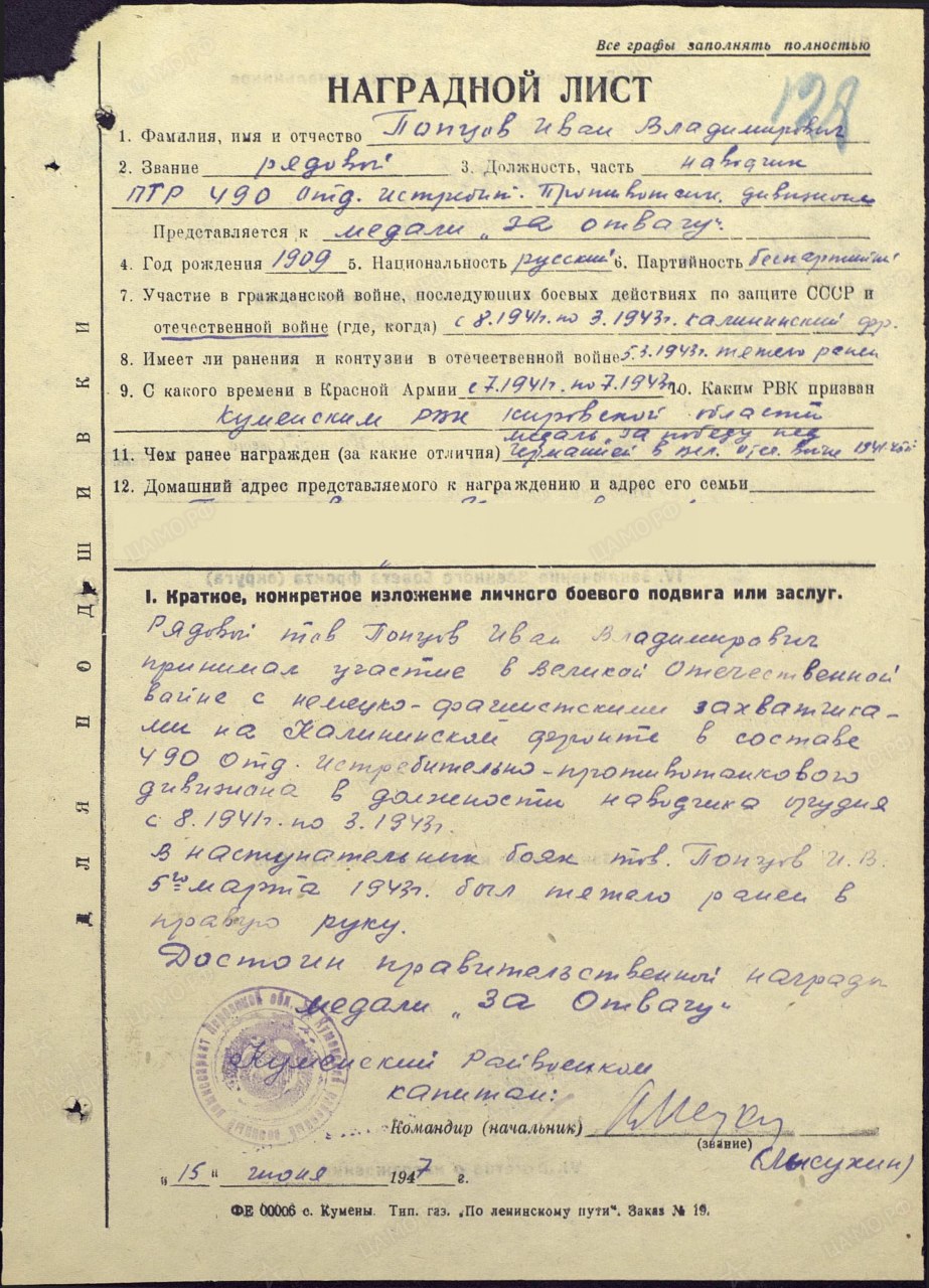 | Участие в Великой отечественной войне в/ч 490 оиптдн Калининский фронт | Между Июль 1941 и Июль 1943 | ||