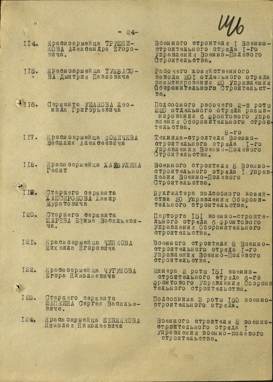 | Награждён: Медаль "За Отвагу" | 08.03.1942 | Получил тяжелое ранение на Харьковском направлении. | |