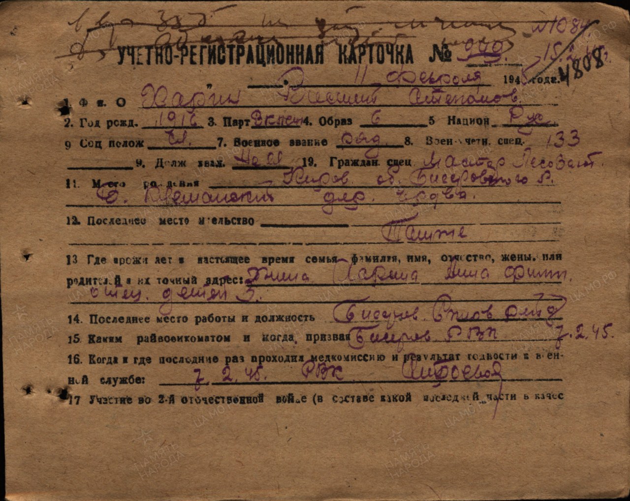 | Призван в РККА | 1942 | деревня Ердвинская (Егорёнки) (Афанасьевский район, Кировская область) - ныне не существует | |