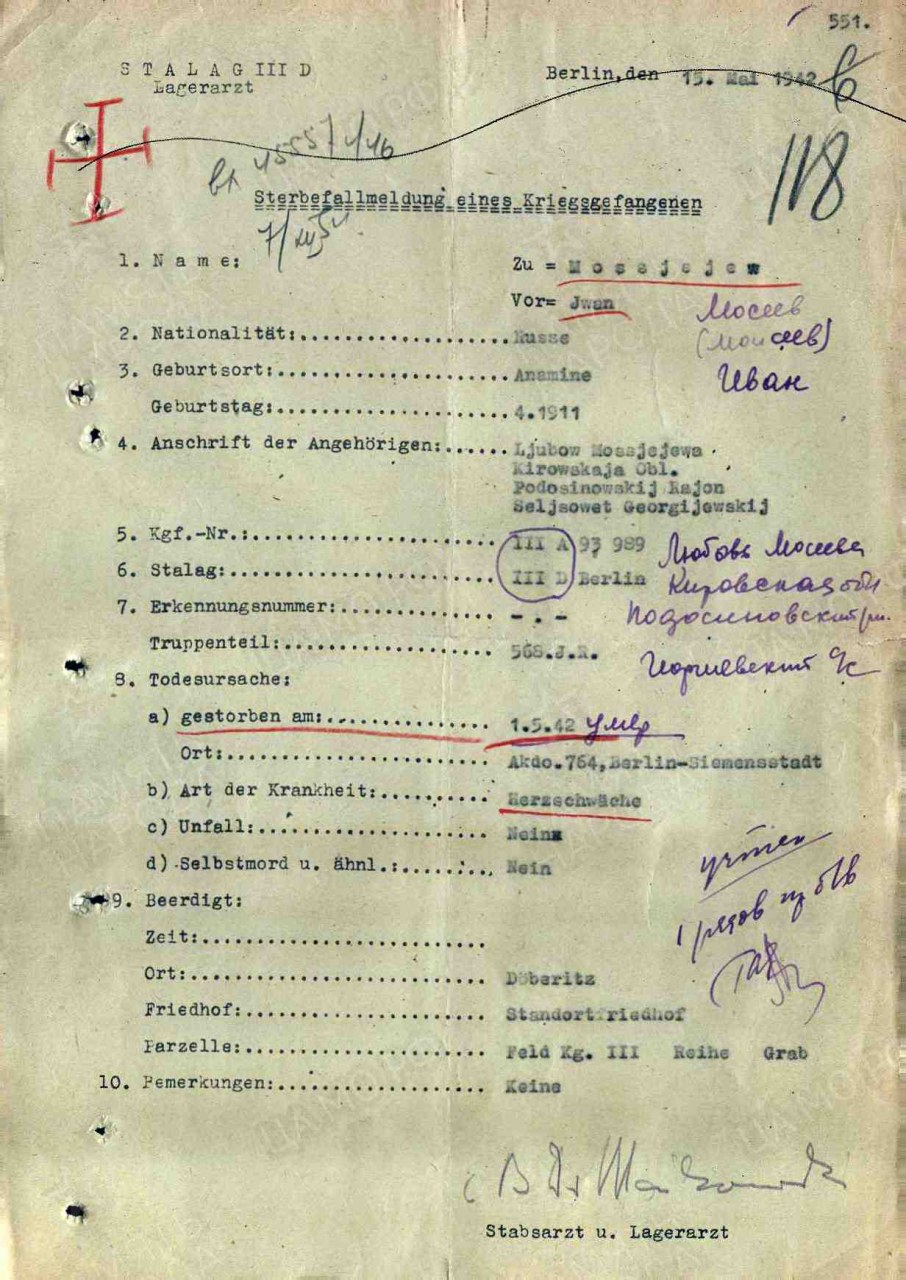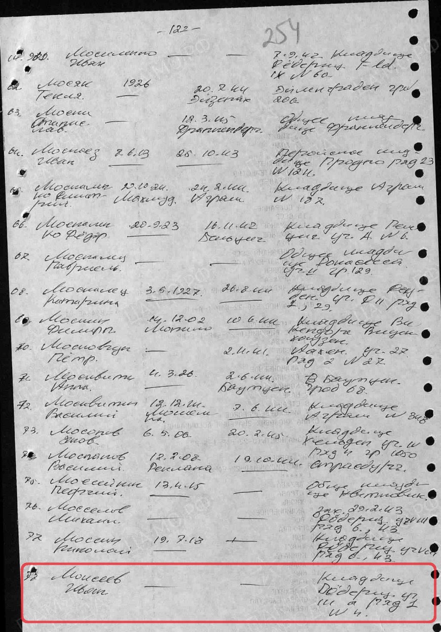 | Умер | 01.05.1942 | Умер в немецком плену, находился в рабочей команде Arb. Kdo. 764 Berlin-Siemensstadt (Берлин-Сименсштадт) | |