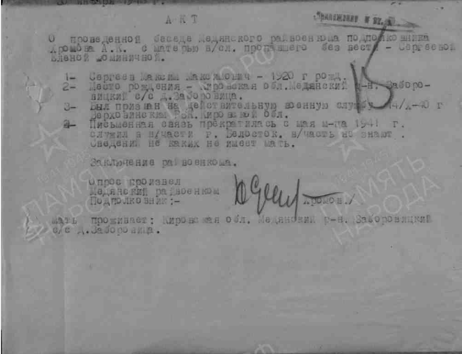 | 4314186025 | СЕРГЕЕВ Максим Максимович | 1920 г. р., из дер. Заборовица Великорецкого с/с, красноармеец, в феврале 1942 г. пропал без вести. | Кировская область, Юрьянский район |