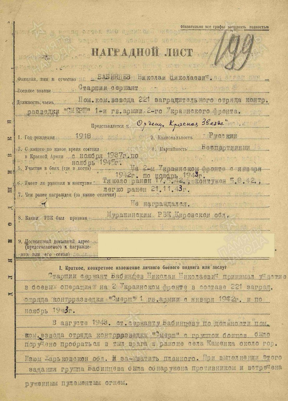 | 4306639002 | БАБИНЦЕВ Николай Николаевич | 1918 г. р., Кировская обл., Медянский р-н, д. Седуновщина, призван 15.07.41 г., рядовой. Погиб на фронте в феврале 1942 г. | Кировская область, Мурашинский район |