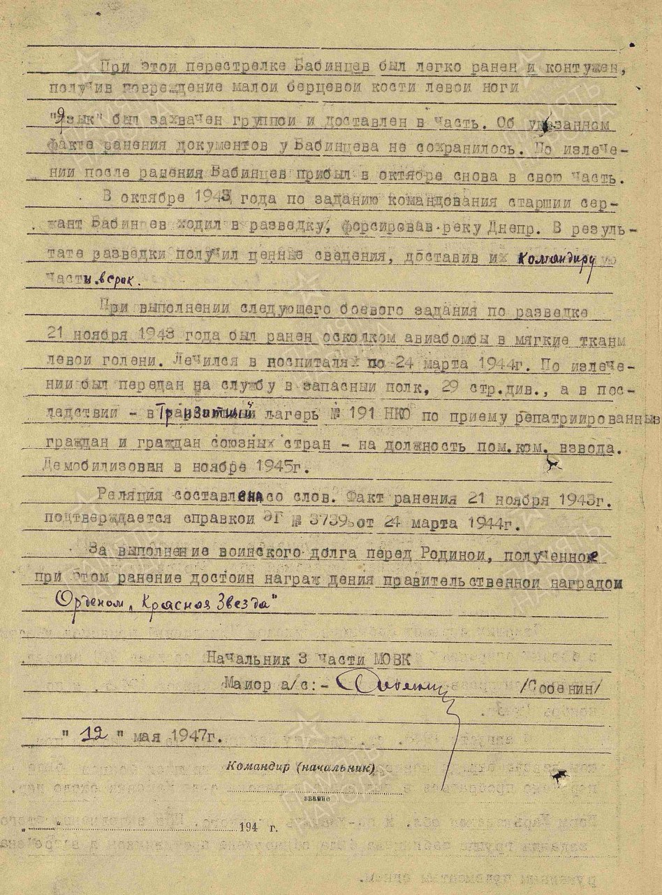 Военно-пересыльный пункт: 34 зсп 29 зспбр Выбытие из воинской части: 05.06.1945