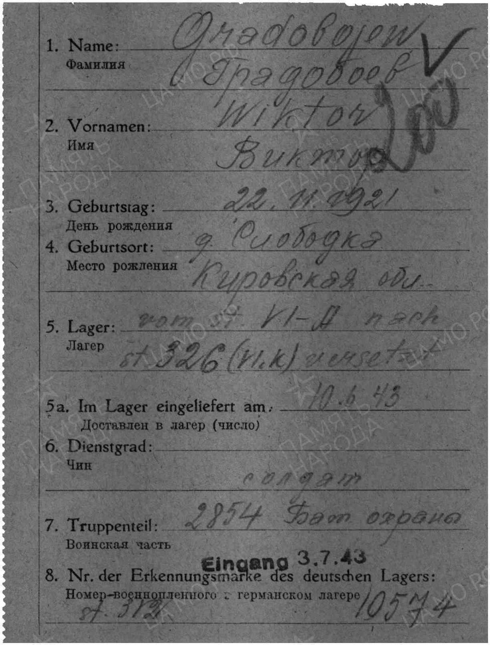 | 4314057008 | ГРАДОБОЕВ Виктор Иванович | 1921 г. р., из д. Слободка Высоковского с/с, красноармеец, в/ч п/я 55, в июле 1943 г. пропал без вести. | Кировская область, Юрьянский район |