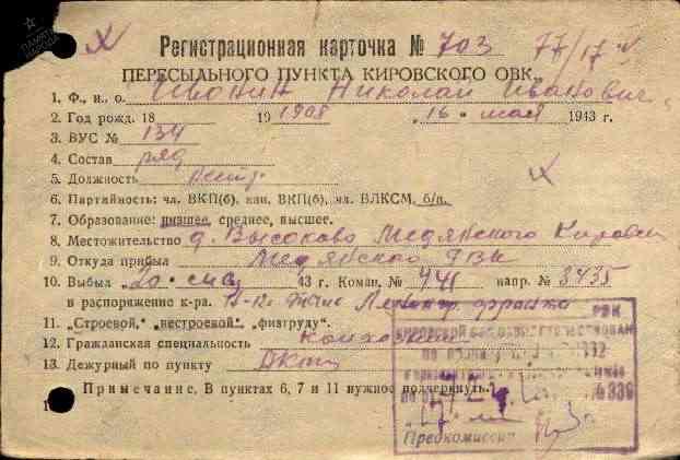 Военно-пересыльный пункт Кировский ВПП Выбытие из воинской части 20.05.1943