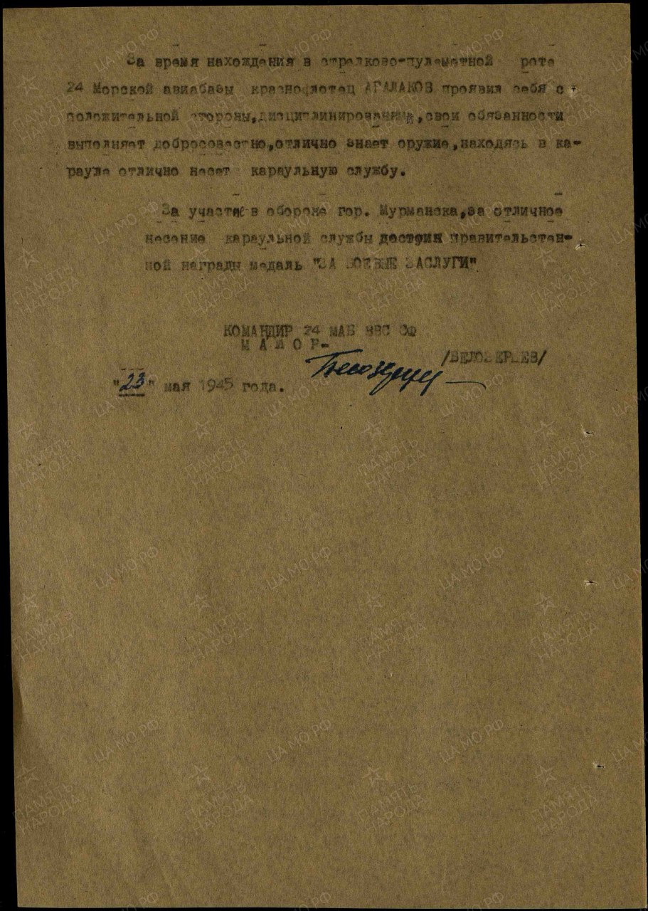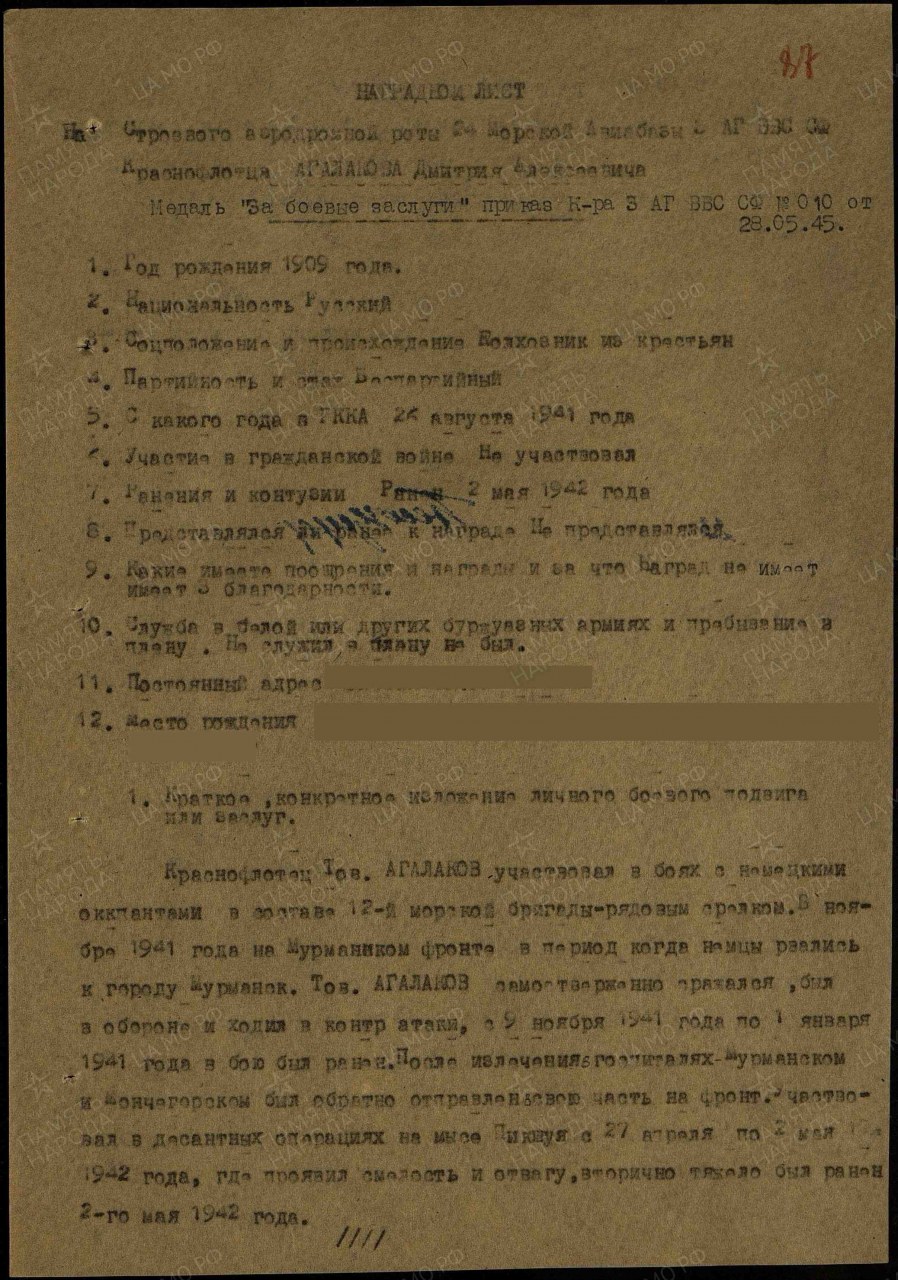 | 4314027017 | АГАЛАКОВ Дмитрий Алексеевич | 1909 г. р., из д. Боярки Медянского с/с, красноармеец, стрелок 4 осб, 12 бриг. мор. пехоты Северного флота, 20.06.1942 г. погиб в бою. Захоронен в г. Мурманске. Комментарий: Ошибочно внесен в Книгу Памяти. При бомбежке его завалило и ранило... Бойцы откопали и доставили в госпиталь. После войны проживал в д. Крутичи, Юрьянского района, работал в колхозе "Память Ильича" в лесу на заготовке леса и на пилораме. Умер - 13.01.1994 | Кировская область, Юрьянский район |