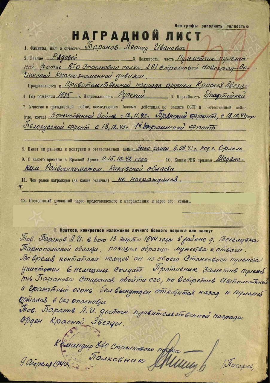 - Ранен 01.04.1944 под г. Броды Западная Украина