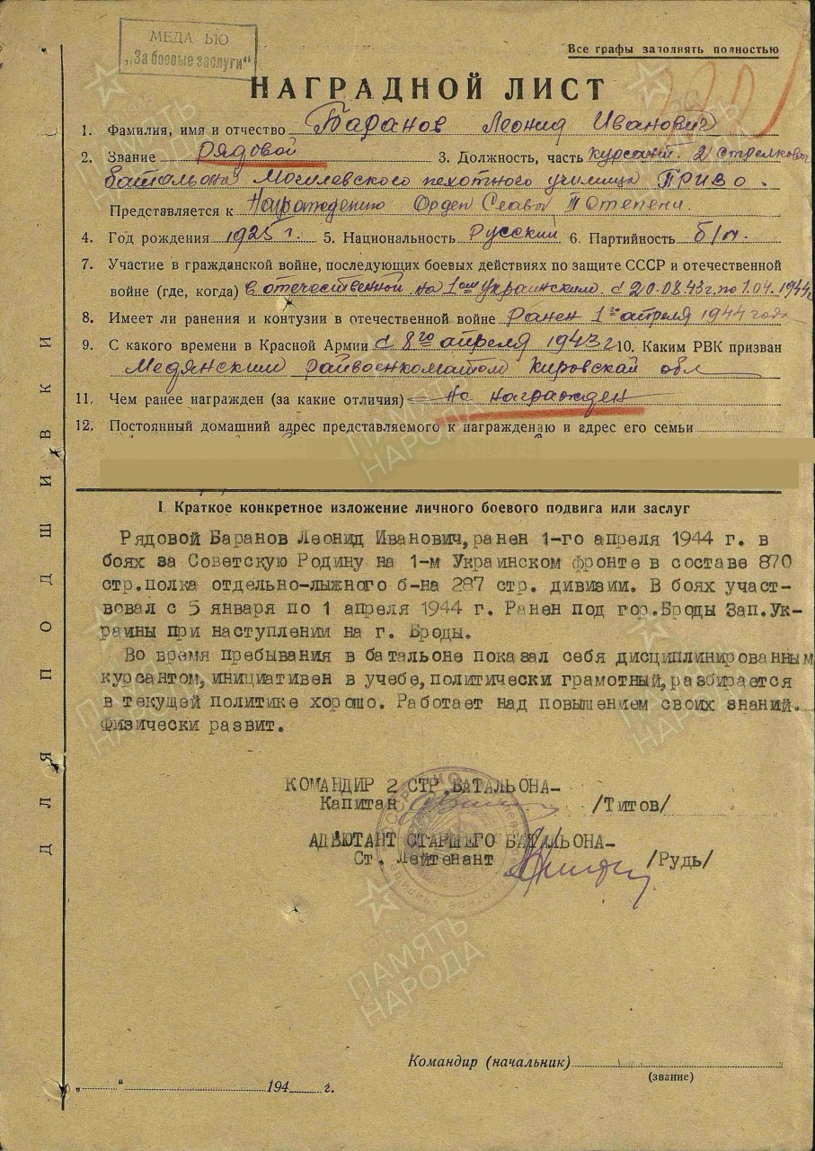 - Медаль «За победу над Германией в Великой Отечественной войне 1941–1945 гг.» Воинское звание: красноармеец Воинская часть: Могилевское ВПУ
