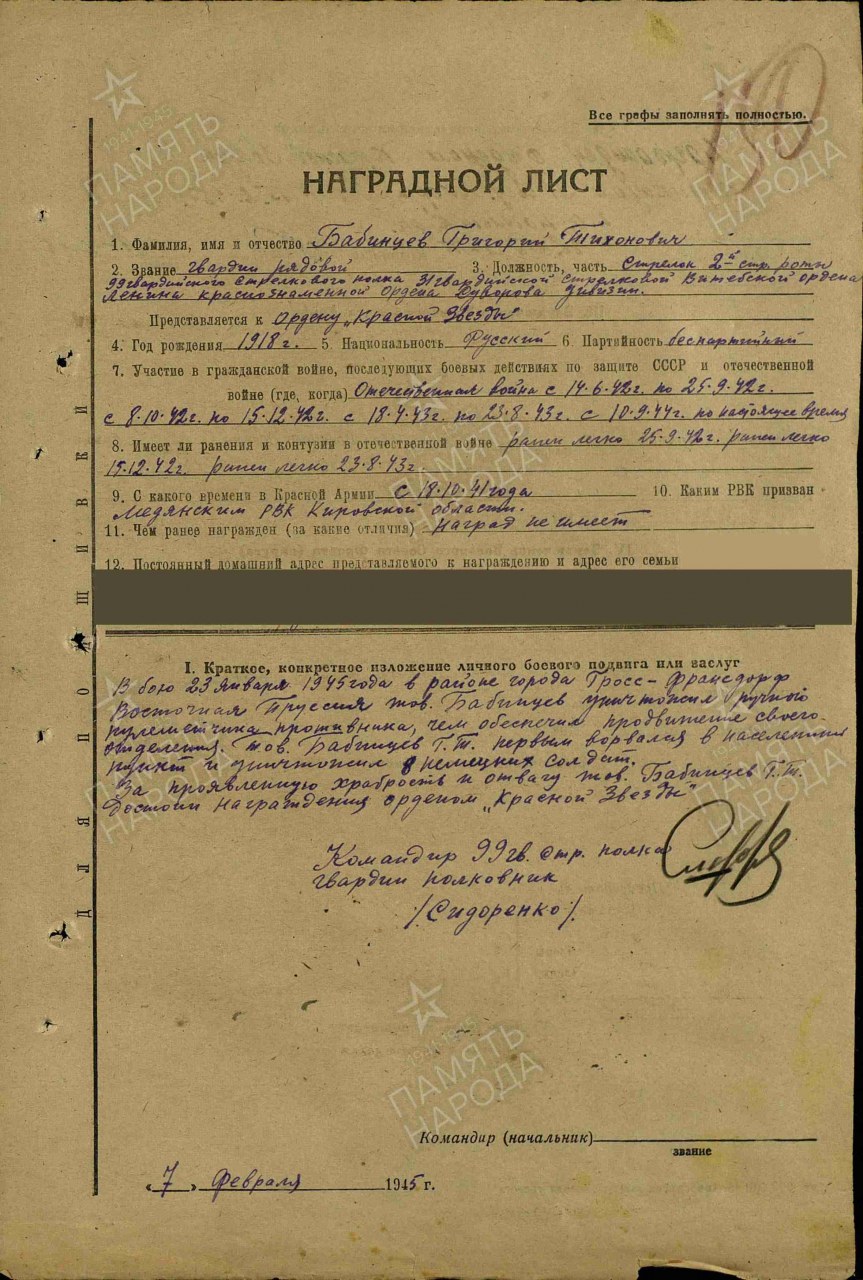 Воинская часть: 99 гв. сп Выбытие из воинской части: 29.01.1945