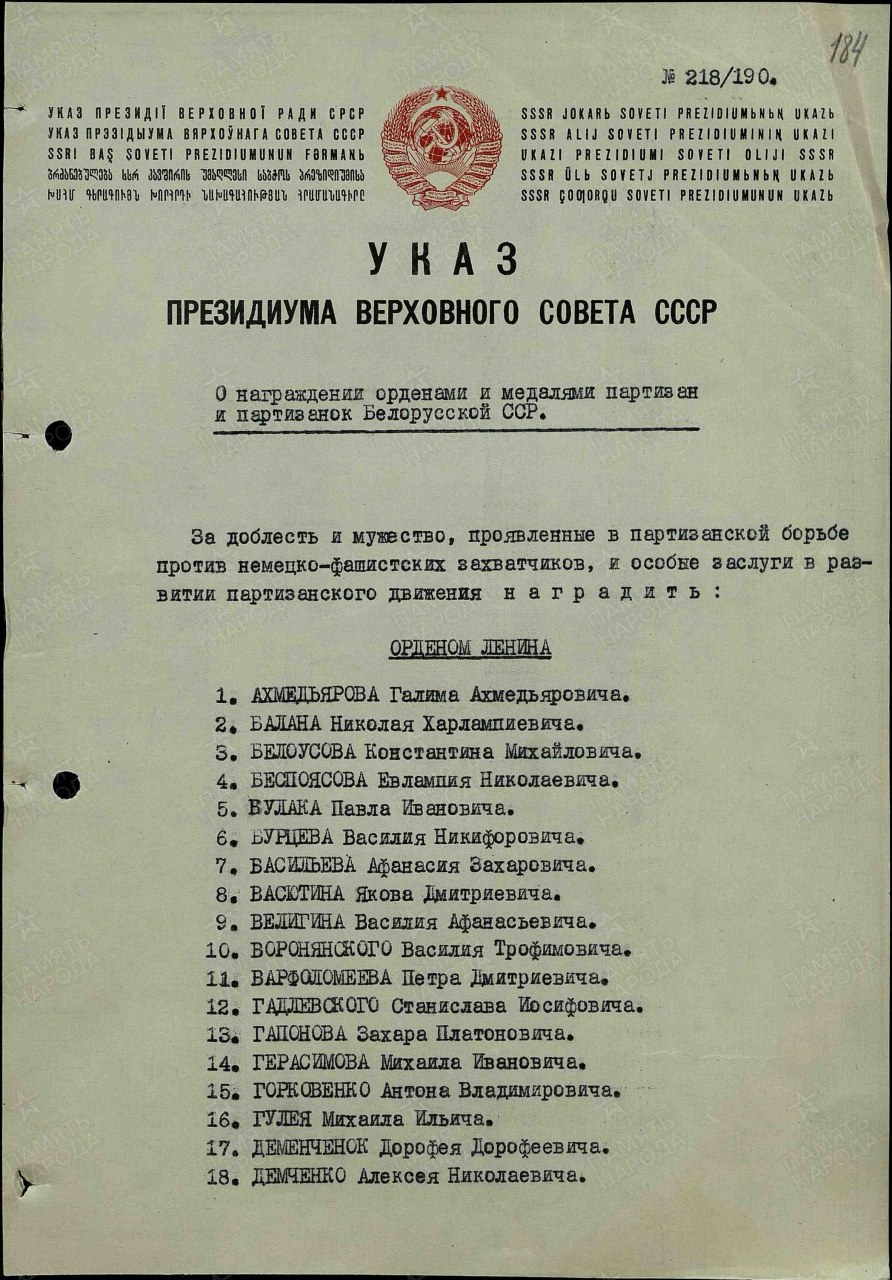 Партизан, погиб в бою 20.09.1942 Белорусская ССР Витебская обл. д. Сквордино