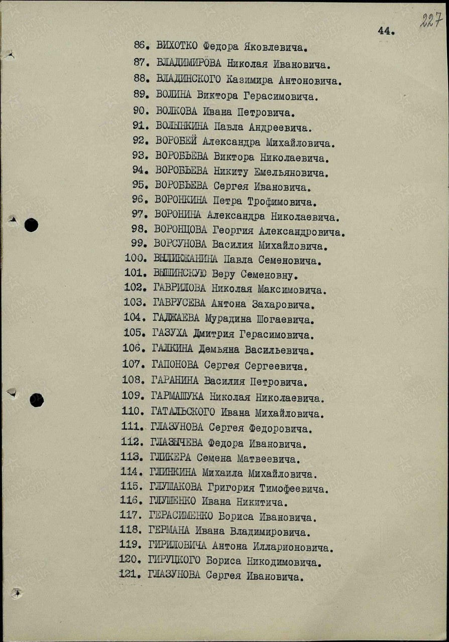 | 4317381020 | ВЫЛЕГЖАНИН Павел Семенович | 1912 г. р., из д. Барановы, Великорецкого с/с, Юрьянского р-на, призван Ждановским ГРВК, красноармеец, стрелок, партизан, погиб в бою 20.09.1942 года. Захоронен в братской могиле на терр. Витебской обл., Белоруссия. (П.) | Кировская область, Киров | |||