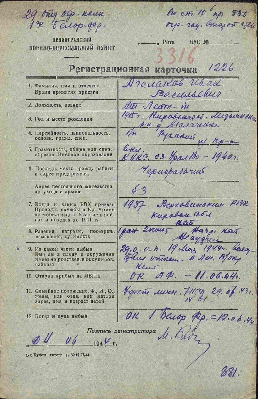 - Военно-пересыльный пункт Ленинградский ВПП (ОК ЛенФ) Выбытие из воинской части 12.06.1944