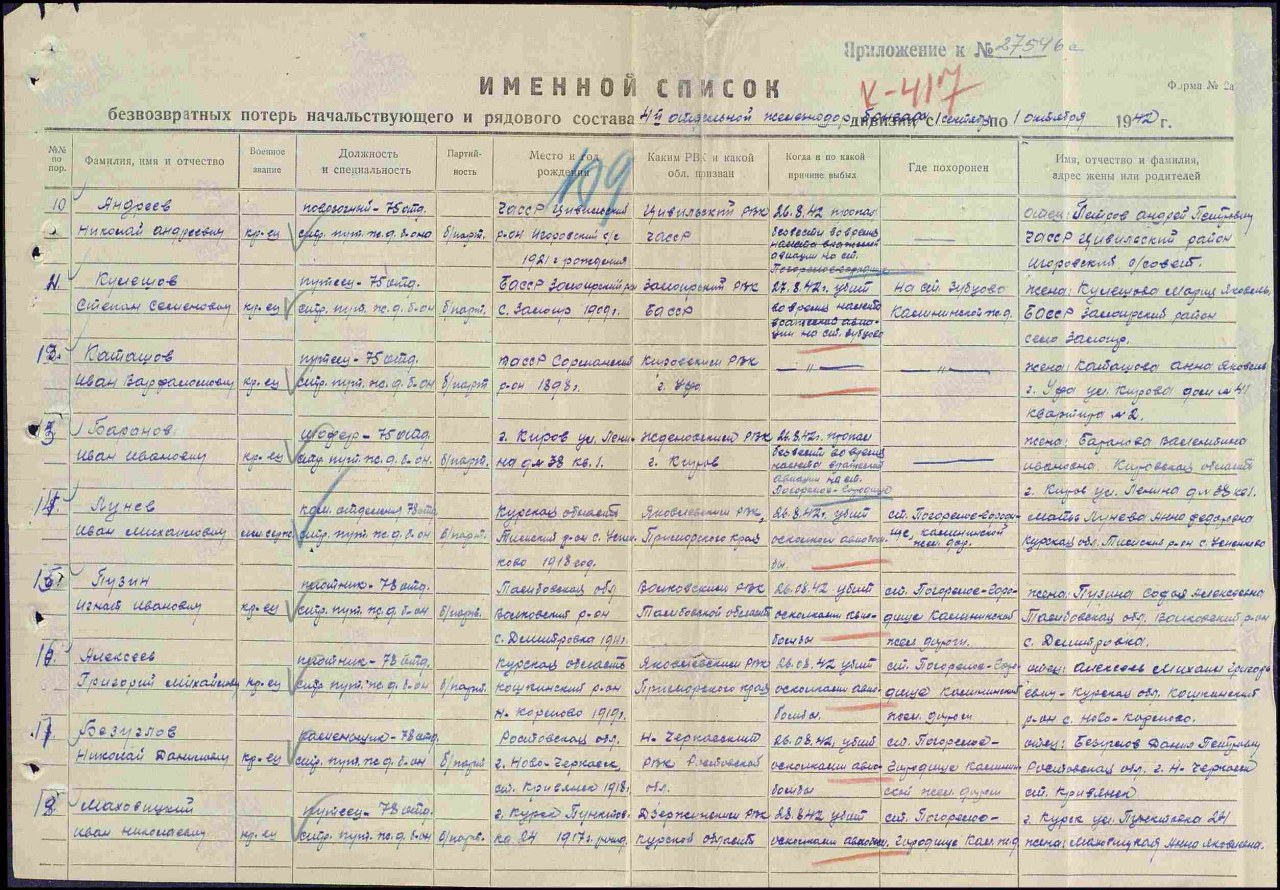 | 4315080018 | БАРАНОВ Иван Иванович | 1908 г. р., гор. Киров, мобилизован Ждановским РВК, красноармеец, шофер 75 жд. мост. батальона, 4 жд. бр. Пропал без вести 26.08.1942 года. | Кировская область, Киров |