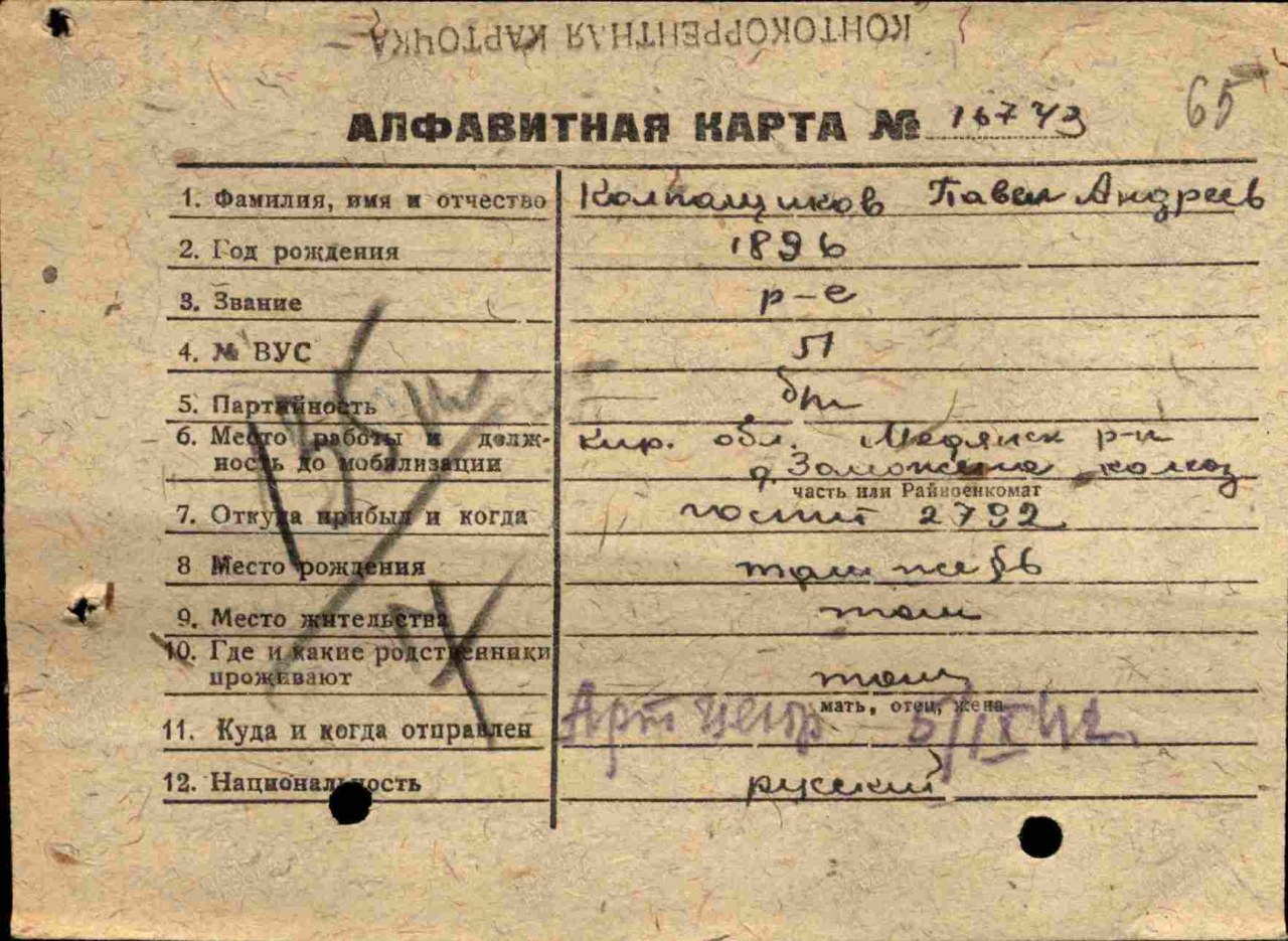 | Родился | 1897 | деревня Заложена (Градобоевская) (Юрьянский район, Кировская область) - существующий н.п. | Брат Колпащиков Сергей Андреевич д. Заложена |