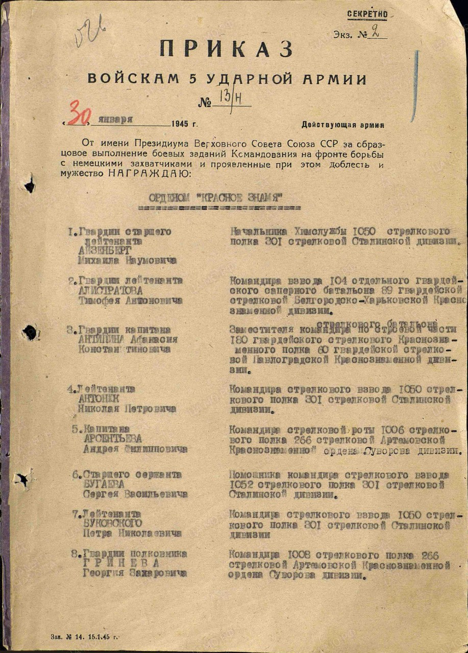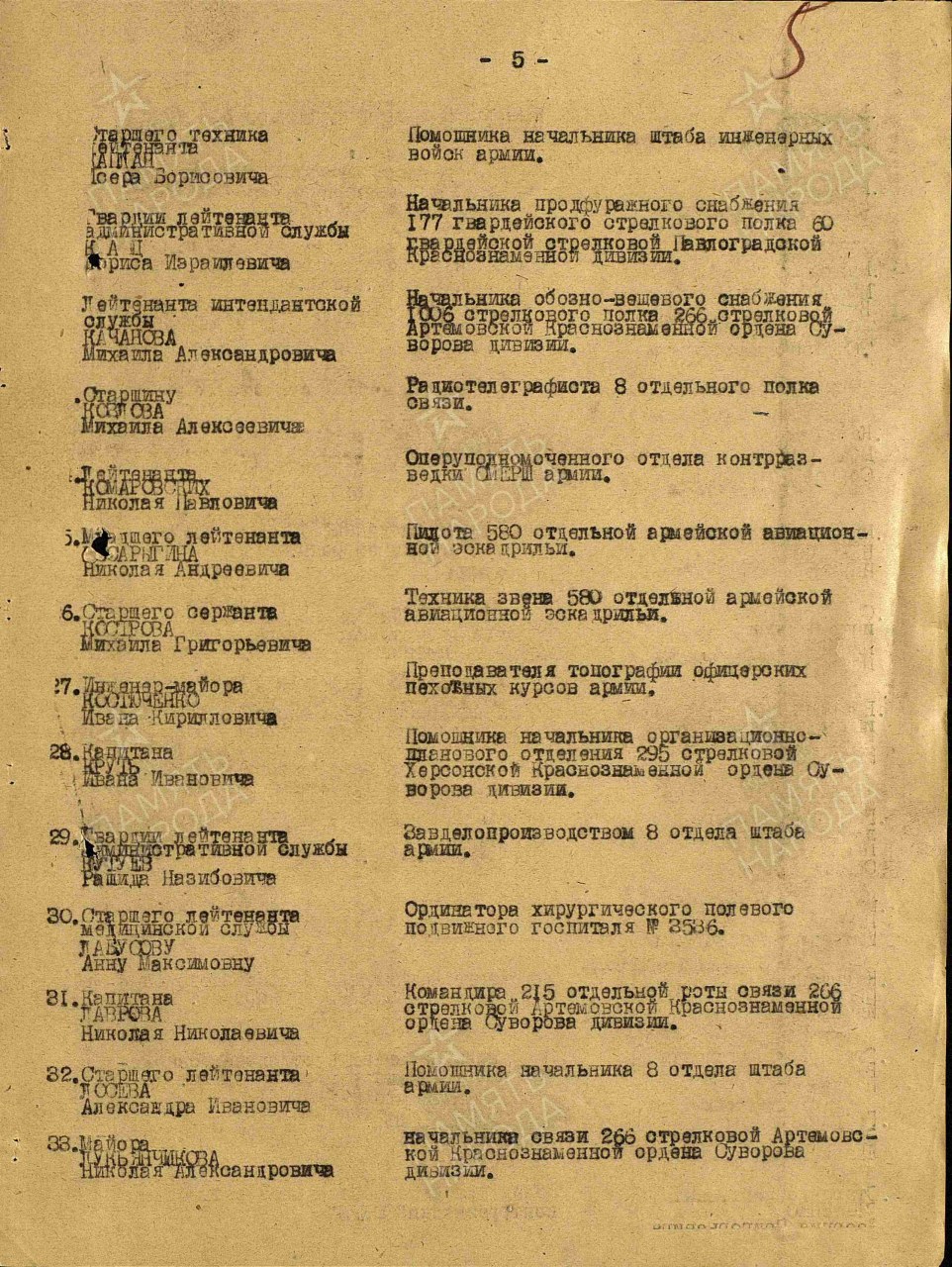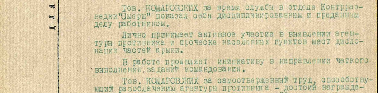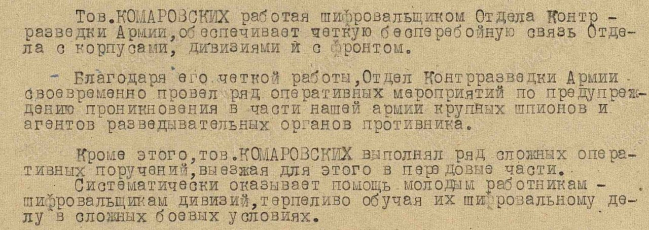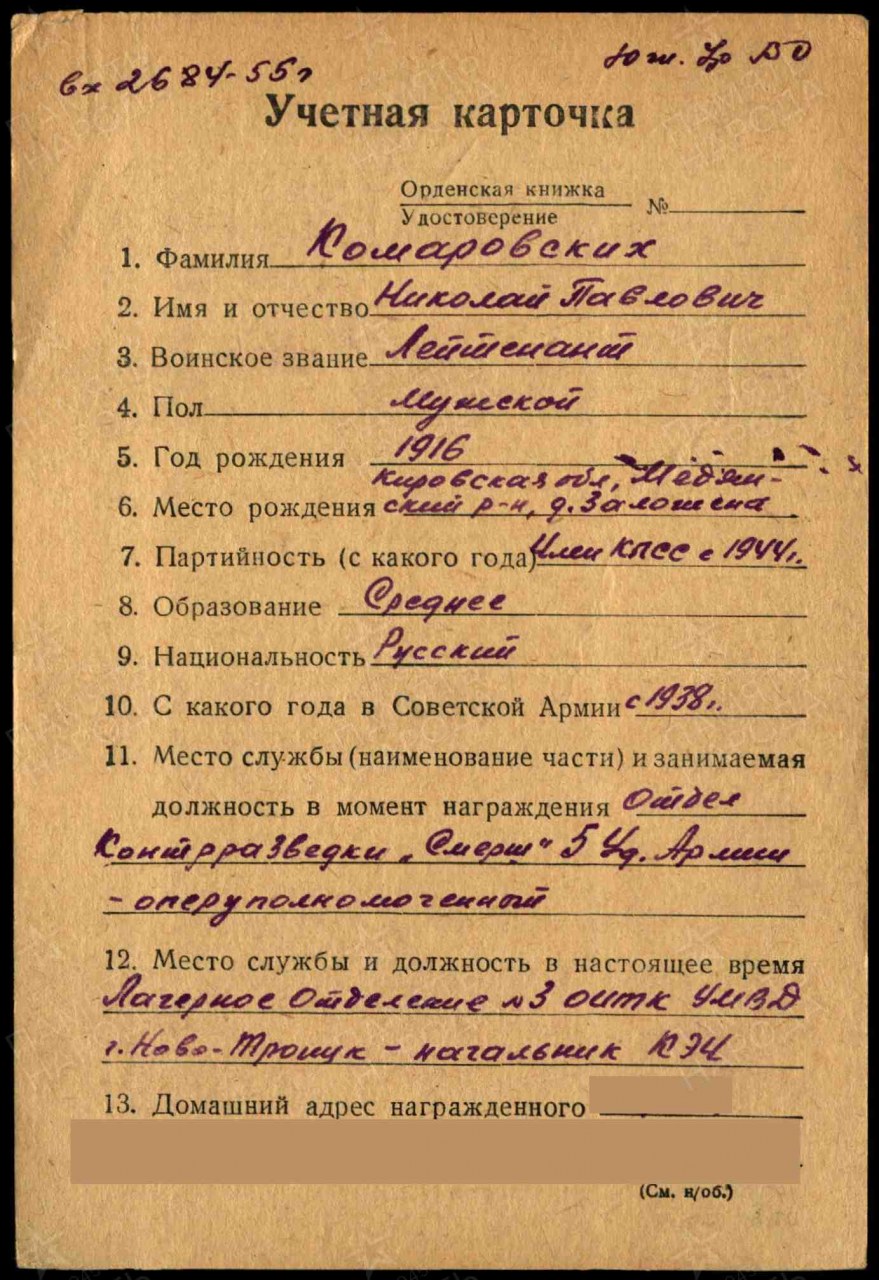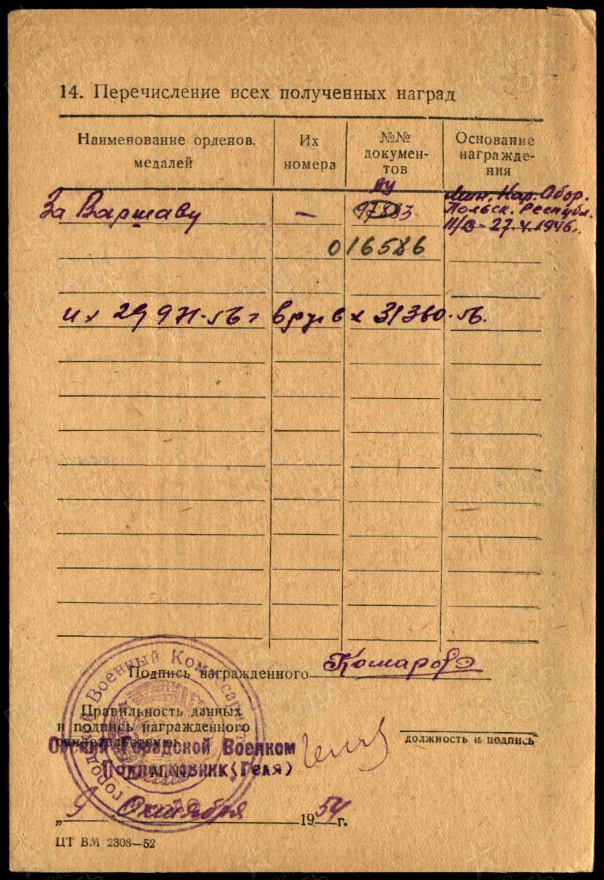 Наименование военкомата: Хабаровский ГВК, Хабаровский край, г. ХабаровскУчастковый инспектор, начальник паспортного стола 1 отд. милиции г.Орска, С 1 июня 1942г. – шифровальщик особого отдела Московского военного округа;https://uchebana5.ru/cont/3501881-p21.htmlНаименование воинской части: МВД,штаб ОКР "СМЕРШ" 5 Уд. АДата окончания службы: 06.03.1961Воинское звание: ст. лейтенант