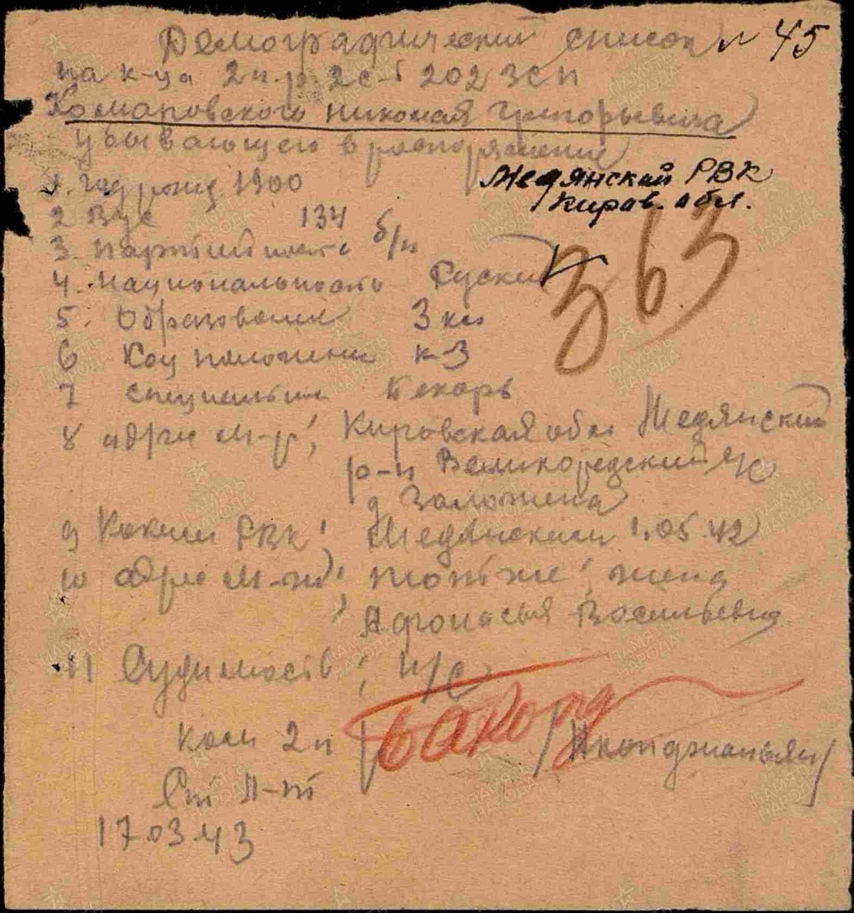 Военно-пересыльный пункт: 202 зсп Выбытие из воинской части: 18.03.1943