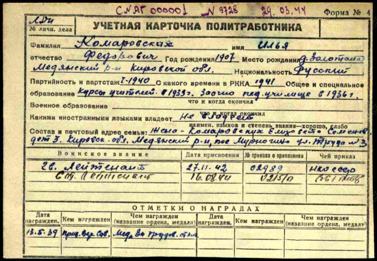 | 4314100005 | КОМАРОВСКИХ Илья Федорович | 1907 г. р., из д. Заложана Великорецкого с/с, гв. лейтенант, парторг дивизиона 10 гв. отд. мех. див., 1 тк, 19.08.1944 года погиб в бою. Захоронен в Литве, Шяуляйский район, м. Ладзивец. | Кировская область, Юрьянский район |