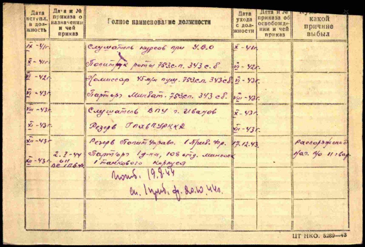 | Погиб | 19.08.1944 | Первичное место захоронения Литовская ССР, Шяуляйский уезд, м. Ладзивщина, северо-западнее, 2 км |