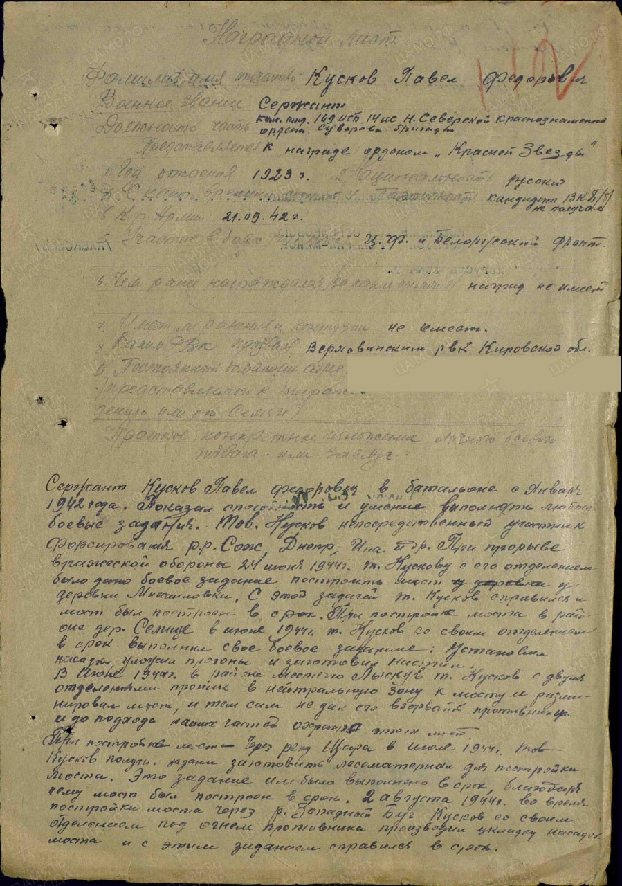 Место службы: 14 инжбрВоинское звание: сержант, командир отделенияГоспиталь: в/ч п/п 77705 1103 СЭГ (санитарно эваукационный госпиталь)Военно-пересыльный пункт: 206 зсп СГВ Прибыл в часть: 23.07.1945Военно-пересыльный пункт: 206 зсп СГВ Выбытие из воинской части: 27.07.1945Куда выбыл: 5 тбр