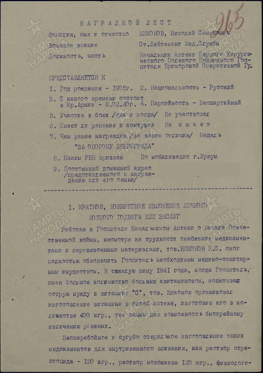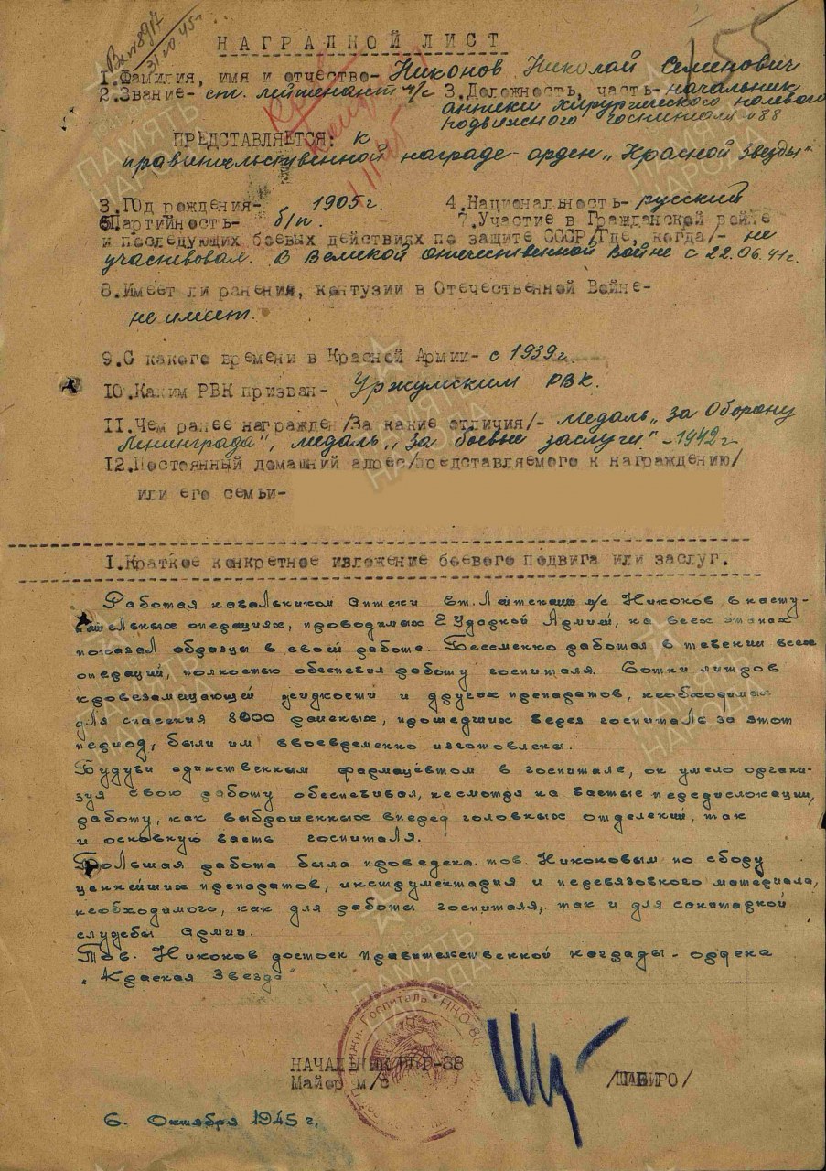 Наименование воинской части: ППГ 11 ск 8 А СЗФ,ППГ 88 4 гв. тдДата окончания службы: 27.11.1946Воинское звание: ст. лейтенант мед. сл.