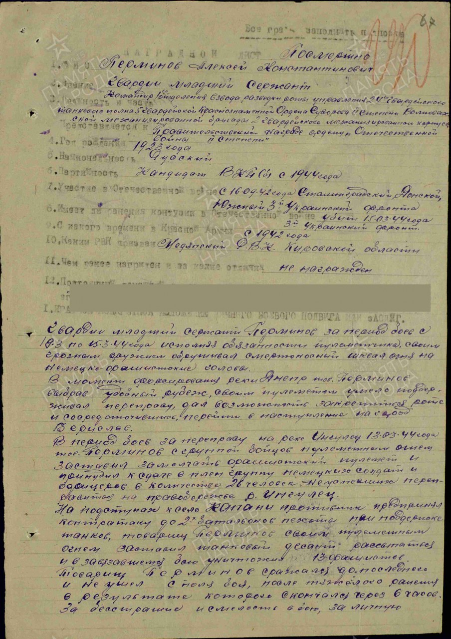 | 4314159009 | ПЕРМИНОВ Алексей Константинович | 1923 г. р., из дер. Бороденская Великорецкого с/с, сержант, командир отделения разведки 24 гв. тп, 5 гв. мбр, 15.03.1944 г. погиб в бою. Захоронен на Украине, Николаевская область, с. Киселевка. | Кировская область, Юрьянский район |
