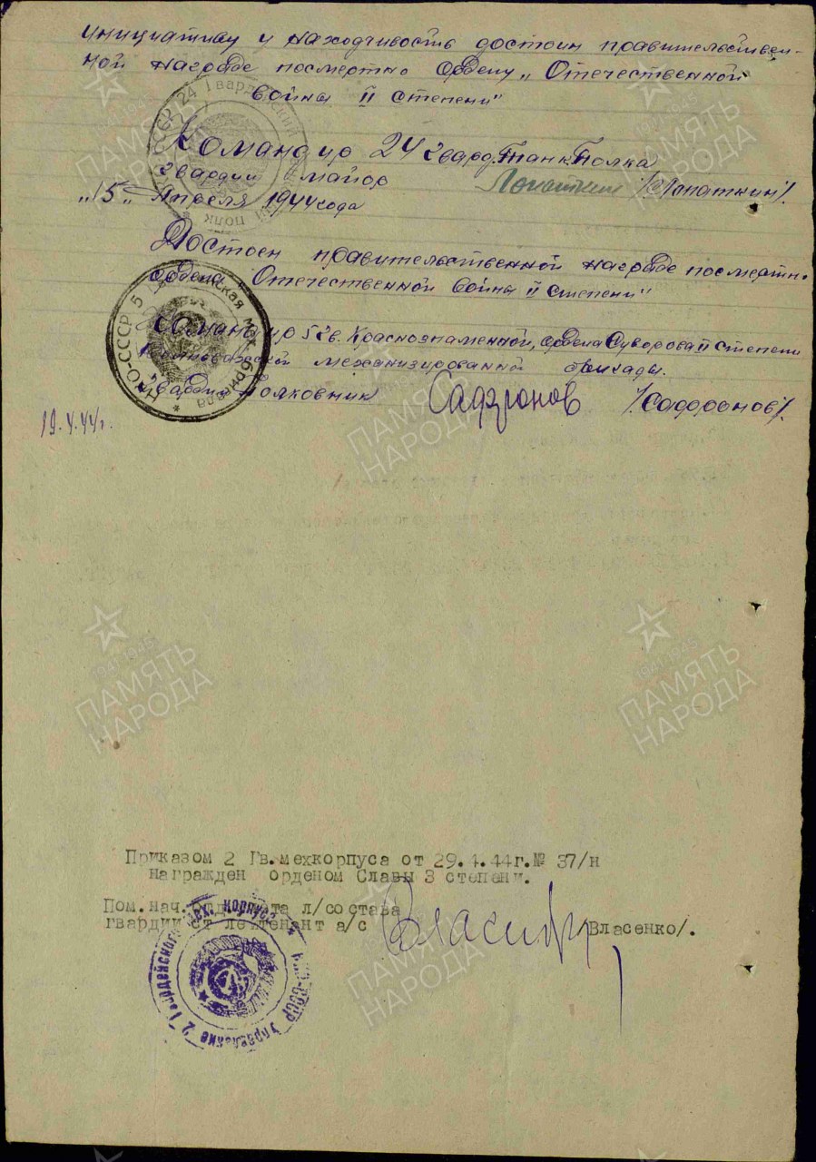 | Погиб | 15.03.1944 | Первичное место захоронения Украинская ССР, Николаевская обл., Херсонский р-н, с. Киселевка, восточная окраина |