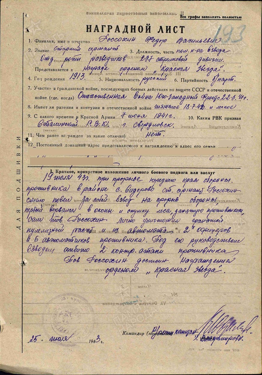 Дата и место призыва 18.06.1941 Октябрьский РВК, Свердловская обл., г. Свердловск, Октябрьский р-н