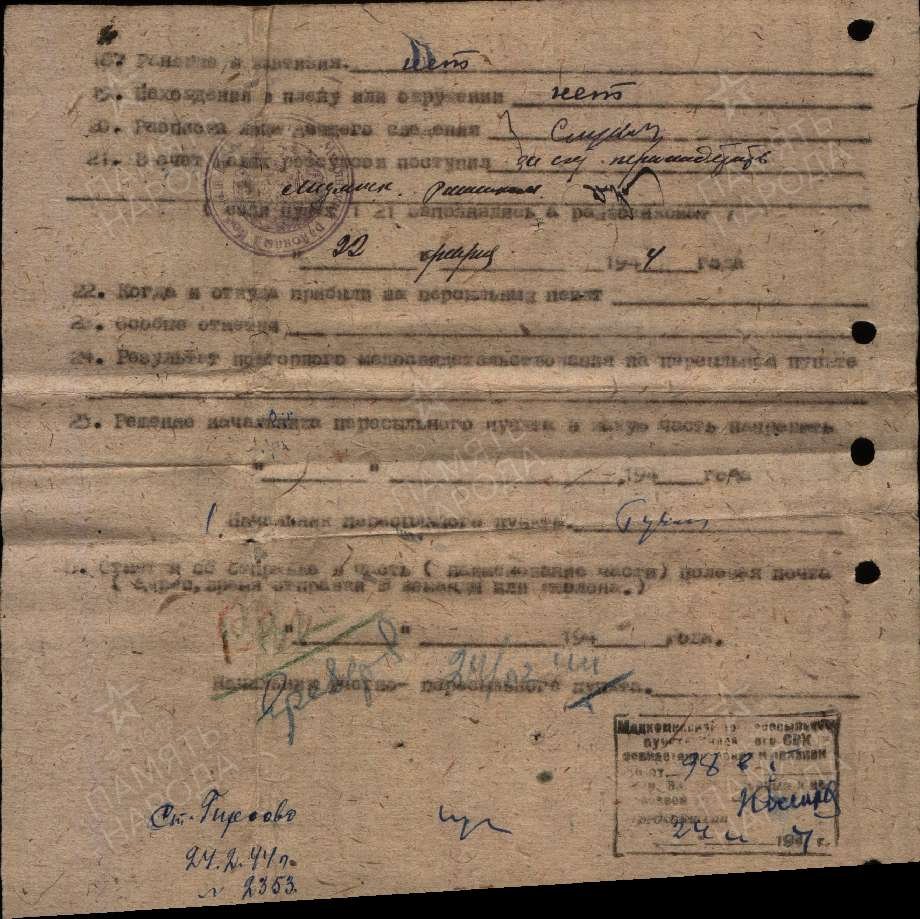 - Военно-пересыльный пункт Кировский ВПП Выбытие из воинской части 24.02.1944
