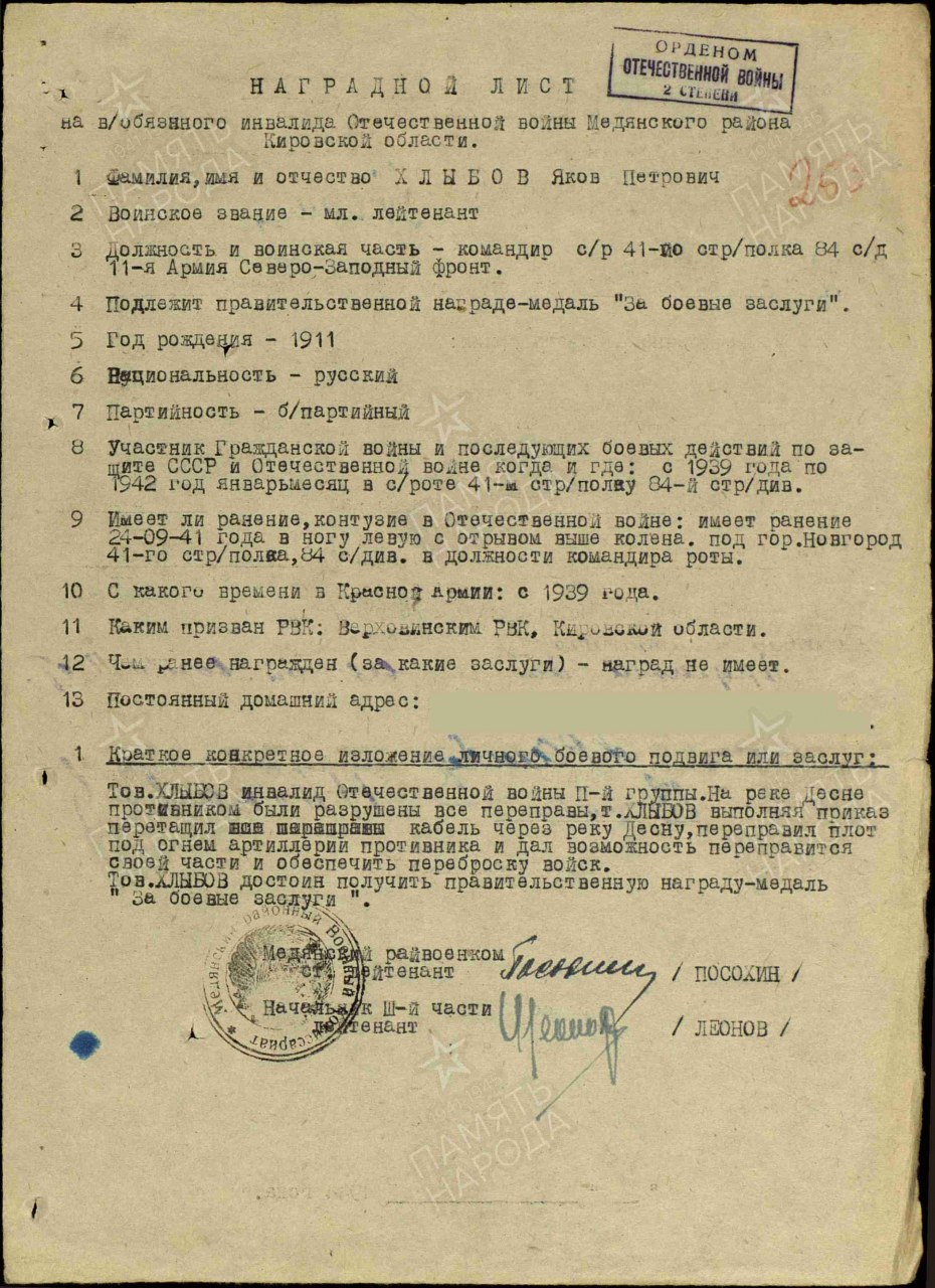 - Яков Петрович Хлыбов родился 4 октября 1911 года в селе Великорецком, был призван в ряды Красной Армии в 1939 году. 22 июня 1941 года встретил в Белоруссии, где служил на пограничной заставе. Был ранен и с 9 октября 1941 года находился в госпитале в г.Горьком, где врачам из- за ранения ему пришлось ампутировать ногу, после чего Яков Хлыбов был комиссован.