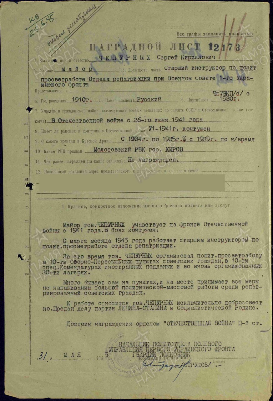 - Место призыва Молотовский РВК, Кировская обл., г. Киров, Молотовский р-н