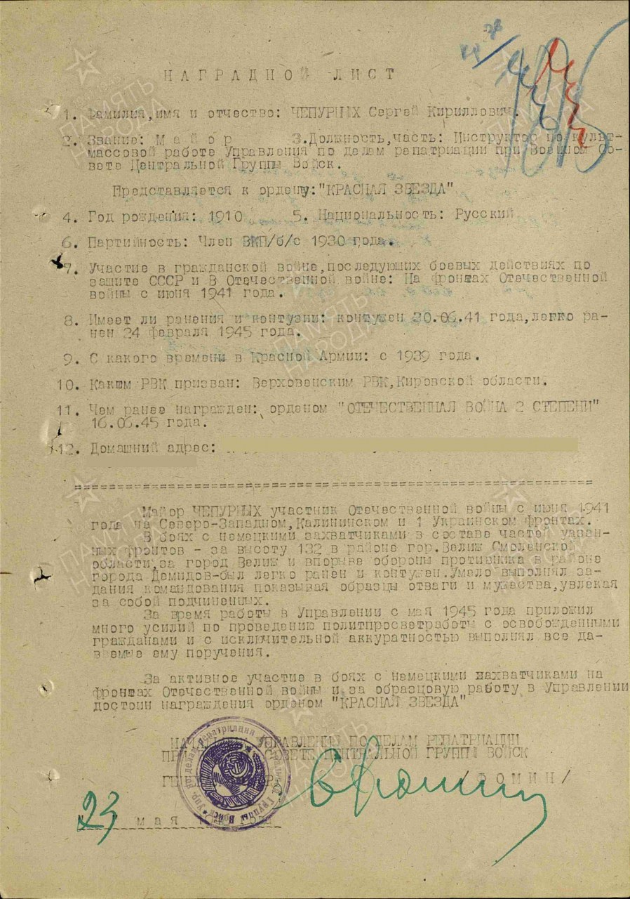 - Ранение 24.02.1945 в бою в районе г. Демидов