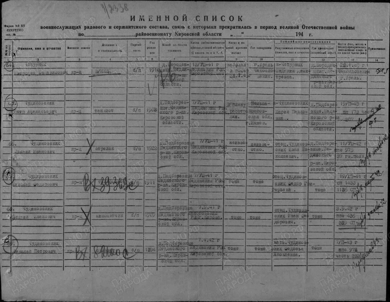 | 4314228012 | ЧЕПУРНЫХ Митрофан Евдокимович | 1900 г. р., из д. Бороденщина Великорецкого с/с, красноармеец, стрелок 06 гв. сд, 11.03.1943 года погиб в бою. Захоронен в Орловской области, Малоархангельский район, дер. Я. Поляна. | Кировская область, Юрьянский район |
