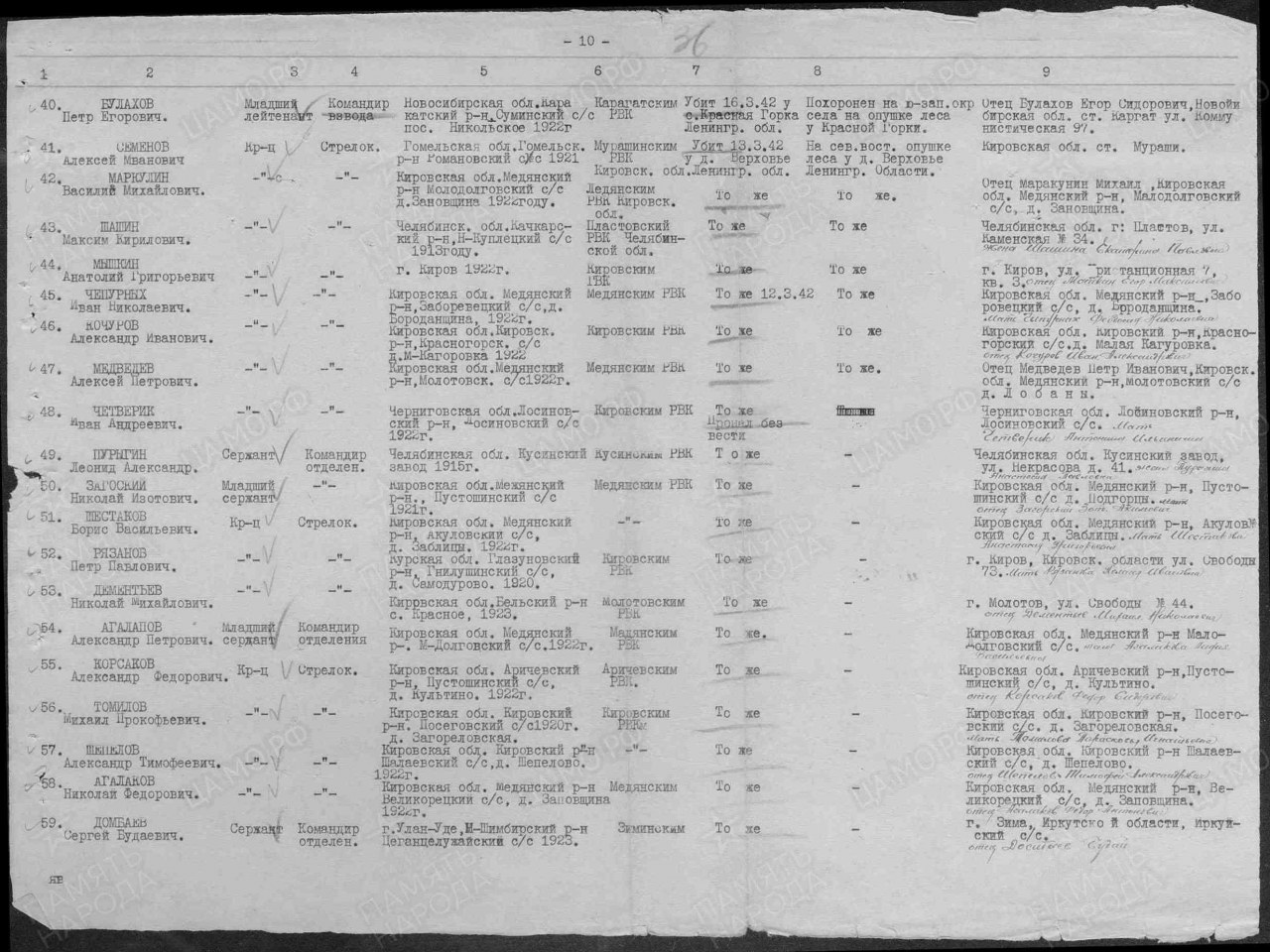 | 4314228011 | ЧЕПУРНЫХ Иван Николаевич | 1922 г. р., из дер. Бороденская Великорецкого с/с, красноармеец, стрелок 1 сб, 25 осбр, 12.03.1942 года погиб в бою. Захоронен в Ленинградской обл., в дер. Верхняя Горка. | Кировская область, Юрьянский район |