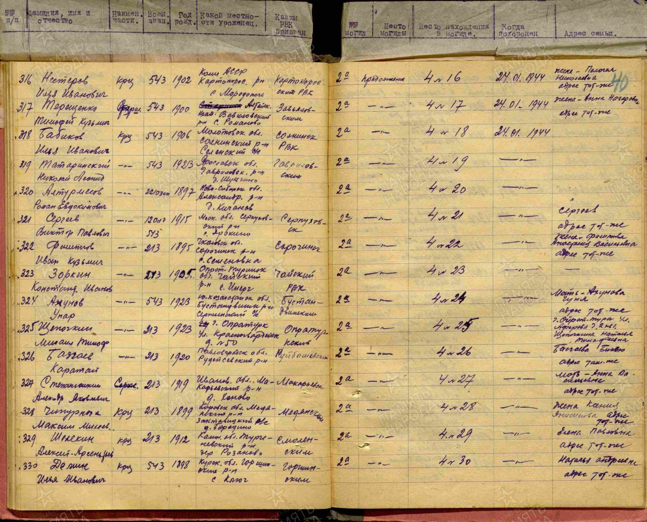 | Погиб | 24.01.1944 | Первичное место захоронения Ленинградская обл., Красносельский р-н, д. Куприяновка, 800 м, карта 1:50000, опушка леса, северо-восточная сторона, могила № 2а, ряд 4, 28-й с южного края, квадрат 40-20 |