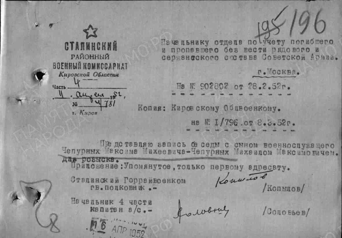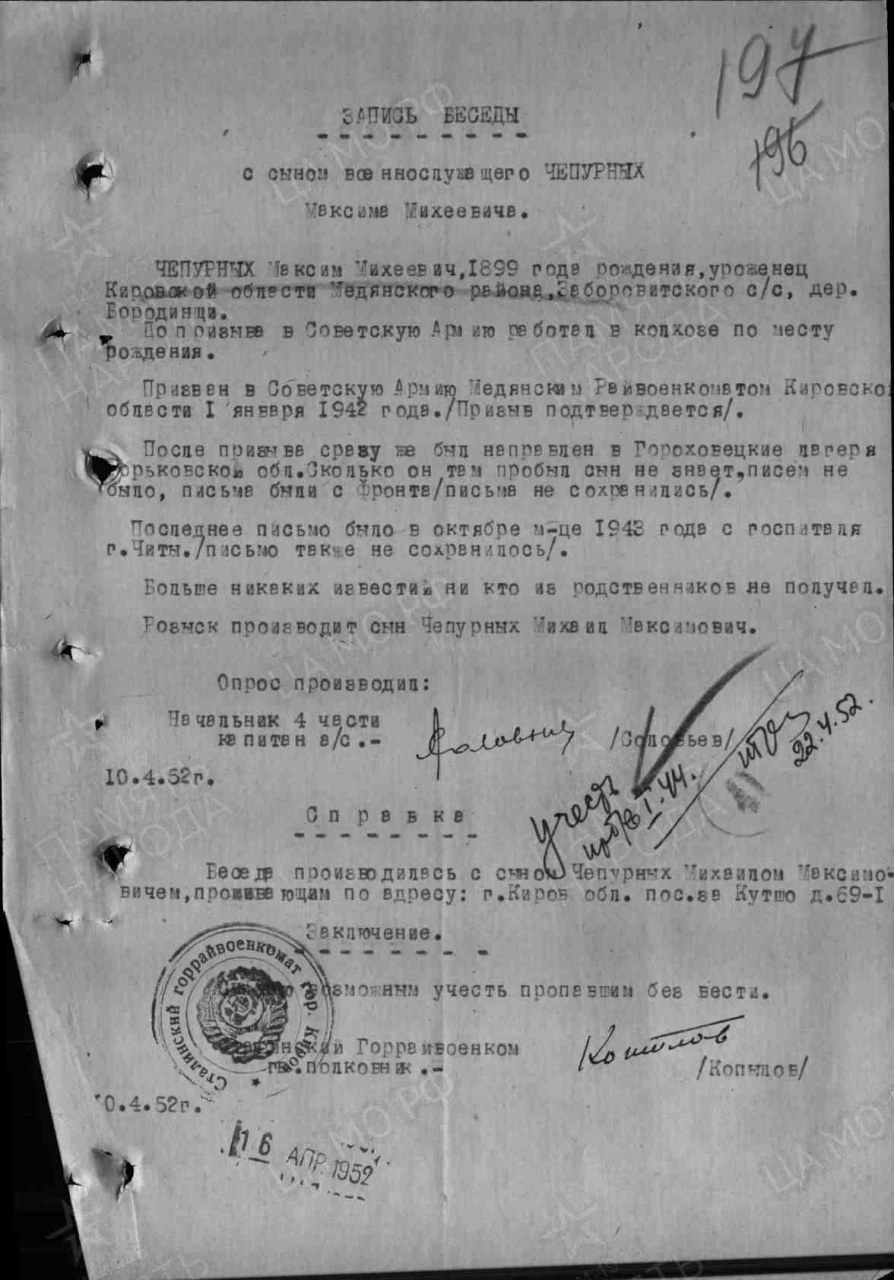 | 4317359019 | ЧЕПУРНЫХ Максим Михайлович | 1899 г. р., из д. Бороденщина Великорецкого с/с, призван Медянским РВК, пропал без вести в январе 1944 года. | Кировская область, Юрьянский район |