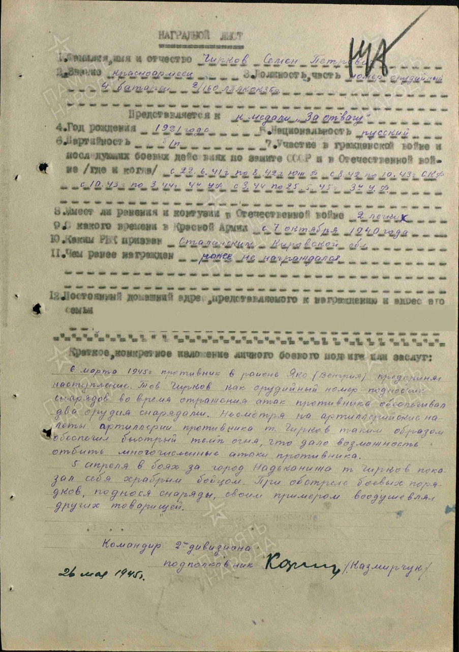- Воинская часть: 972 гап Дата прибытия: 30.09.1945