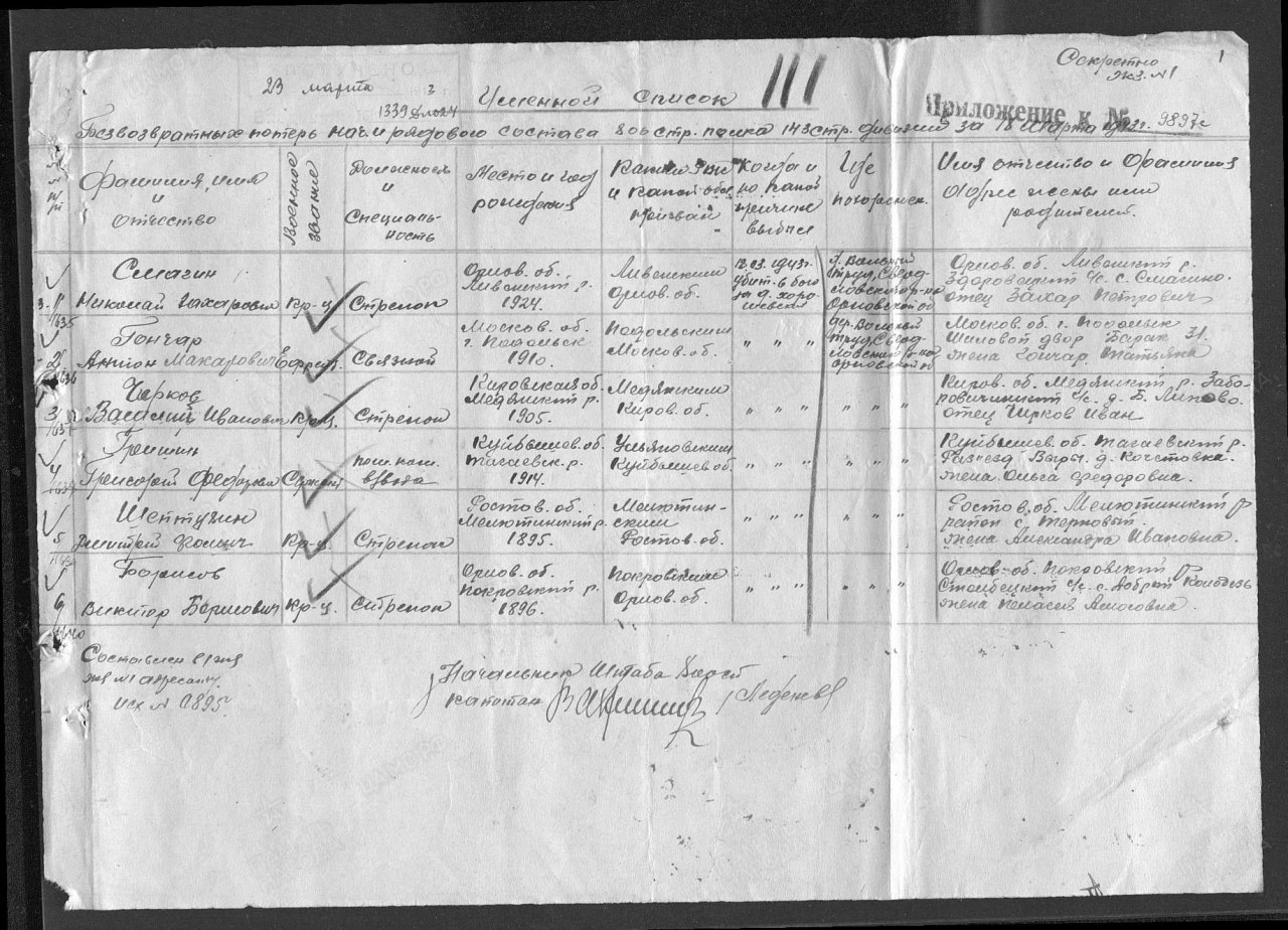 | 4314230023 | ЧИРКОВ Василий Иванович | 1905 г. р., из дер. Липово Монастырского с/с, красноармеец, стрелок 806 сп, 48 Армии, 143 сд, 18.03.1943 года погиб в бою. Захоронен в Орловской области, Свердловский район, дер. Вольный труд. | Кировская область, Юрьянский район |