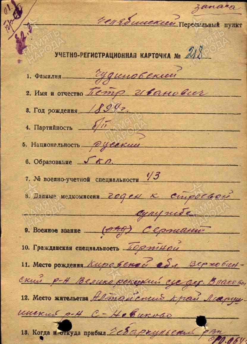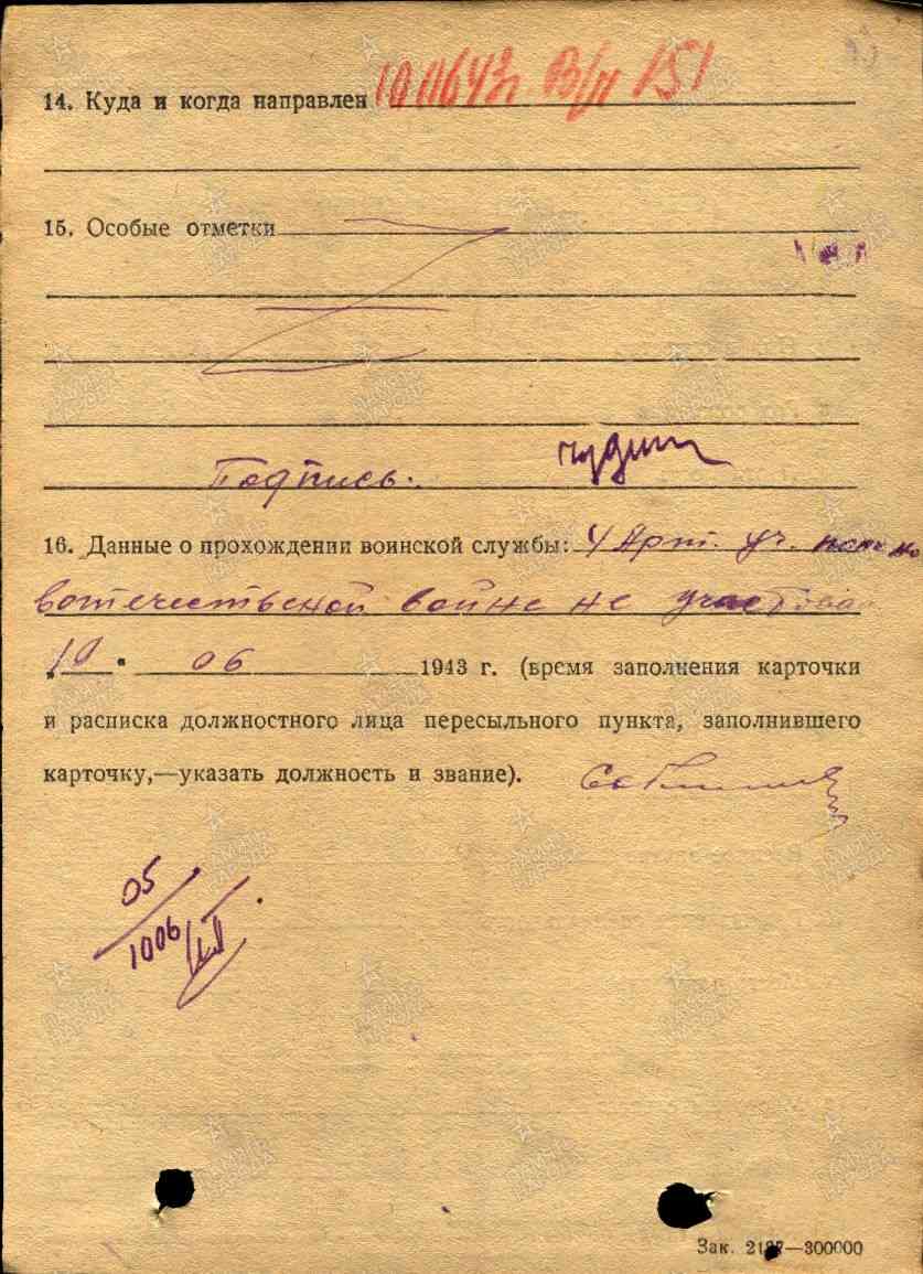 - Военно-пересыльный пункт Челябинский ВПП Выбытие из воинской части 10.06.1943