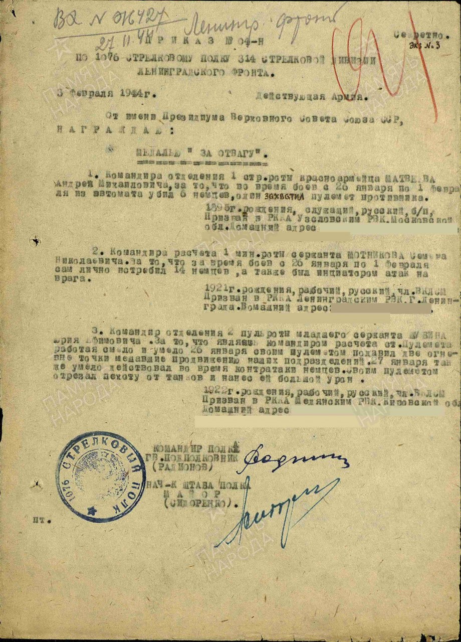 | Погиб | 31.01.1944 | Первичное место захоронения Ленинградская обл., Кингисеппский р-н, с. Красный Партизан, в районе |