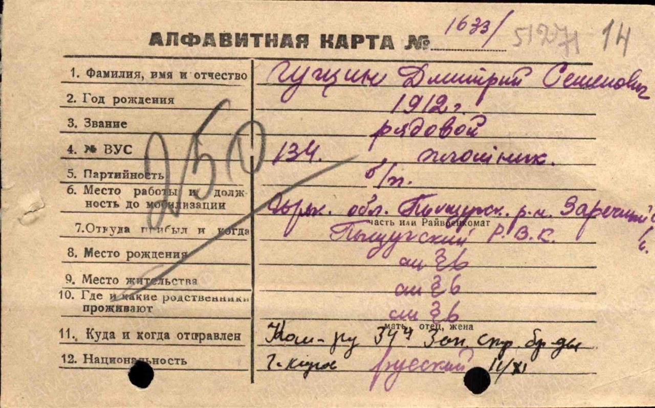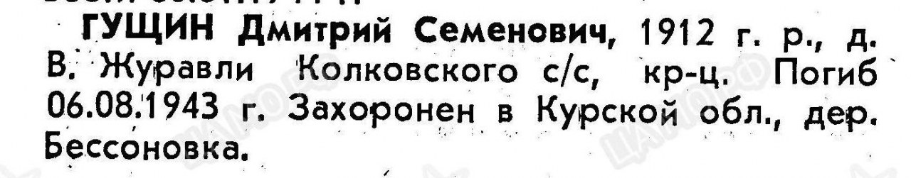 | 4303065015 | ГУЩИН Дмитрий Семенович | 1912 г. р., д. Тимошонки Свиреповского с/с, призван Пишучским РВК Горьковской обл., красноармеец, телефонист 8 вдгап, 6 вдгд, погиб в бою 06.08.1943 г., захоронен: Курская обл., ок. церкви с. Бессоново. | Кировская область, Даровский район | |||