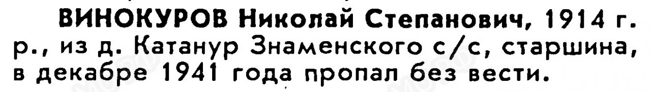 | 4314303026 | ВИНОКУРОВ Николай Степанович | 1914 г. р., из д. Катанур Знаменского с/с, старшина, в декабре 1941 года пропал без вести. | Кировская область, Яранский район |