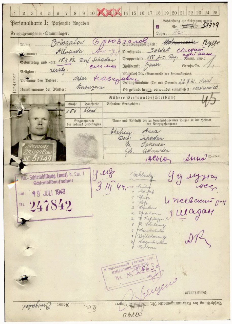 | 1806227037 | БРЫЗГАЛОВ Александр Назарович | род. 1917, д. Шадан. Призван в Сов. Армию в 1941. Рядовой. Умер в плену, март 1944. | Удмуртская Республика, Малопургинский район | |||