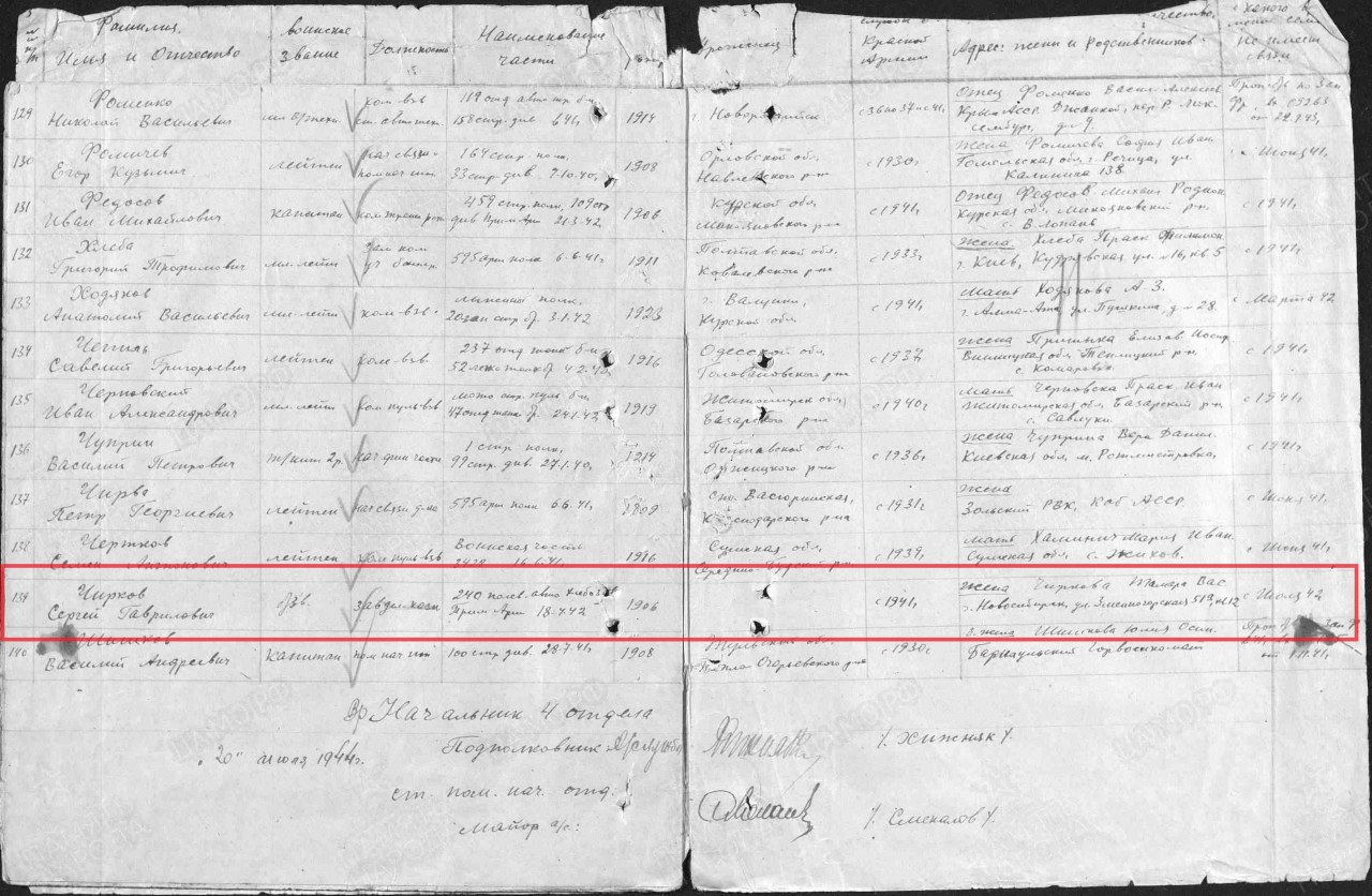 жена - Чиркова Тамара Васильевна (г. Киров, ул. Володарского, № 7 [г. Новосибирск, ул. Змеиногорская, д. 51-а, кв. 12]